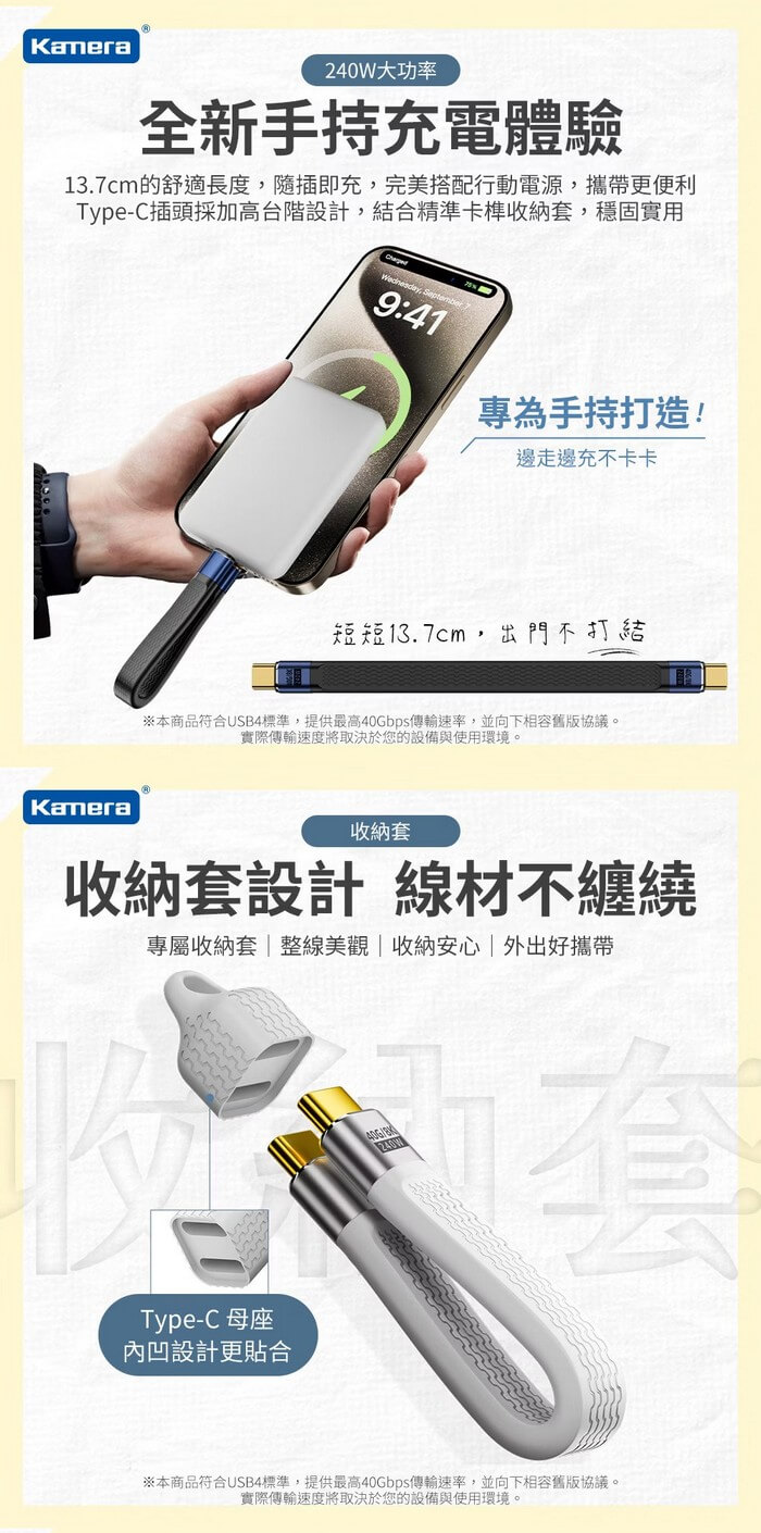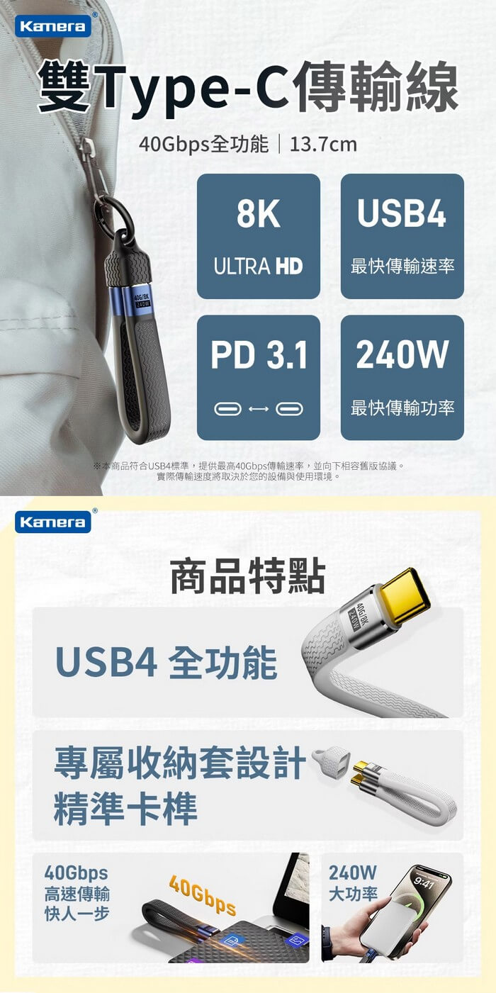 - 主商品:USB4 8K 40Gbps 240W PD3.1 雙Type-C充電傳輸線 黑色(13.7CM)X1