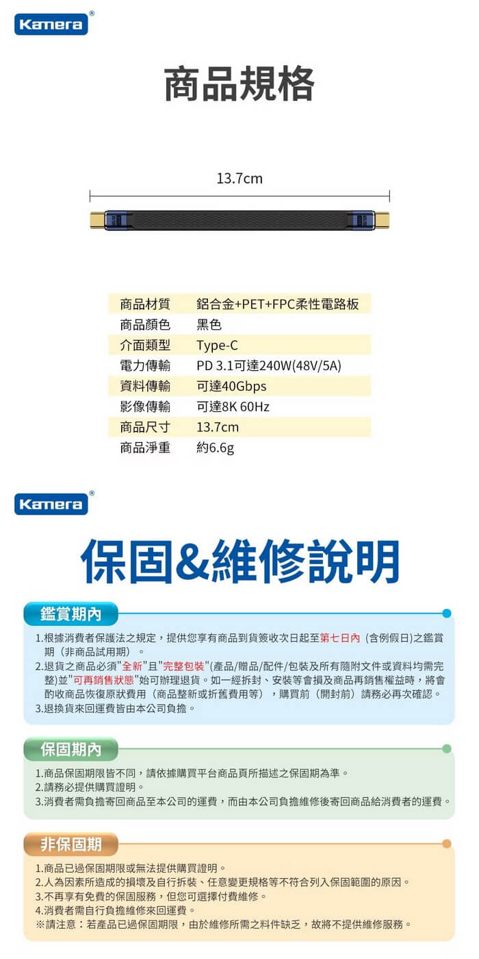 - 主商品尺寸/規格/重量/密度:品名:USB4 8K 40Gbps 240W PD3.1 雙Type-C充電傳輸線 黑色(13.7CM) 商品材質:鋁合金+PET+FPC柔性電路板 商品顏色:黑色 介面類型:Type-C 電力傳輸:PD 3.1 可達240W(48V/5A) 資料傳輸:可達40Gbps 影像傳輸:可達8K 60Hz 商品尺寸:13.7cm 包裝尺寸:約114×68×25mm 商品淨重:約6.6g 商品毛重:約11.8g 包裝內容:USB4 8K 40Gbps 240W PD3.1 雙Type-C充電傳輸線 黑色(13.7CM)X1 保固:180天(非人為因素損壞) 備註:此賣場不含主機相關展示商品