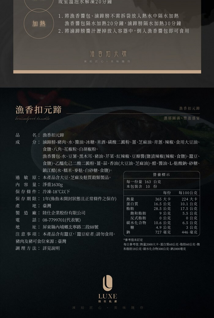 - 主商品尺寸/規格/重量:品名:【陸仕麵館】韻藏中餐廳|漁香扣元蹄 內容量:1630g 原產地:台灣 保存期限:冷凍-18度以下,12個月(未開封狀態且正常條件之保存) 製造廠商或國內負責廠商名稱:陸仕企業股份有限公司 製造廠商或國內負責廠商電話:07-322-9435 製造廠商或國內負責廠商地址:屏東縣內埔鄉北寧路二段88號 投保產品責任險字號:131014AKP0000012 食品業者登錄字號:T-183414913-00000-0