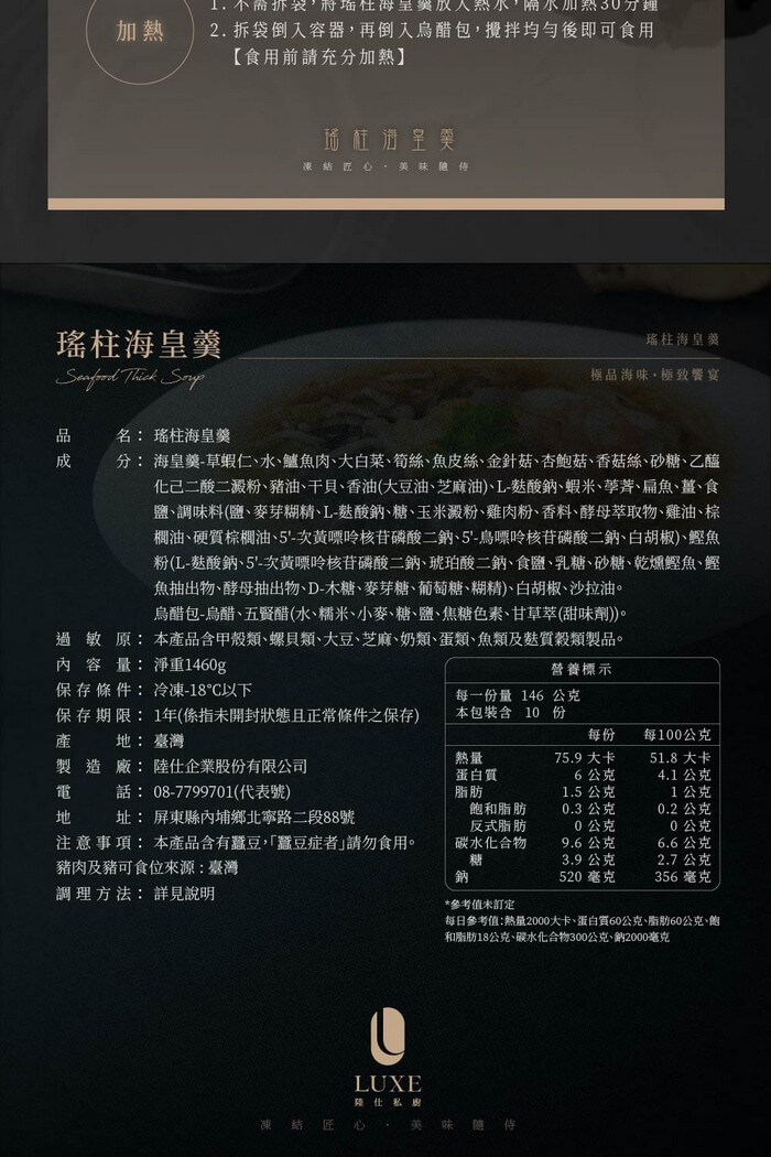 - 主商品尺寸/規格/重量:品名:【陸仕麵館】韻藏中餐廳|瑤柱海皇羹 內容量:1460g 原產地:台灣 保存期限:冷凍-18度以下,12個月(未開封狀態且正常條件之保存) 製造廠商或國內負責廠商名稱:陸仕企業股份有限公司 製造廠商或國內負責廠商電話:07-322-9435 製造廠商或國內負責廠商地址:屏東縣內埔鄉北寧路二段88號 投保產品責任險字號:131014AKP0000012 食品業者登錄字號:T-183414913-00000-0