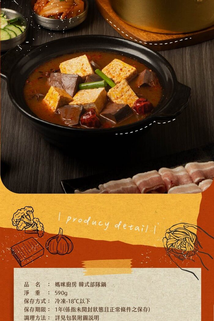 - 主商品尺寸/規格/重量:品名:【陸仕麵館】媽咪廚房|韓式部隊鍋 內容量:590g*3 原產地:台灣 保存期限:冷凍-18度以下,12個月(未開封狀態且正常條件之保存) 製造廠商或國內負責廠商名稱:陸仕企業股份有限公司 製造廠商或國內負責廠商電話:07-322-9435 製造廠商或國內負責廠商地址:屏東縣內埔鄉北寧路二段88號 投保產品責任險字號:131014AKP0000012 食品業者登錄字號:T-183414913-00000-0