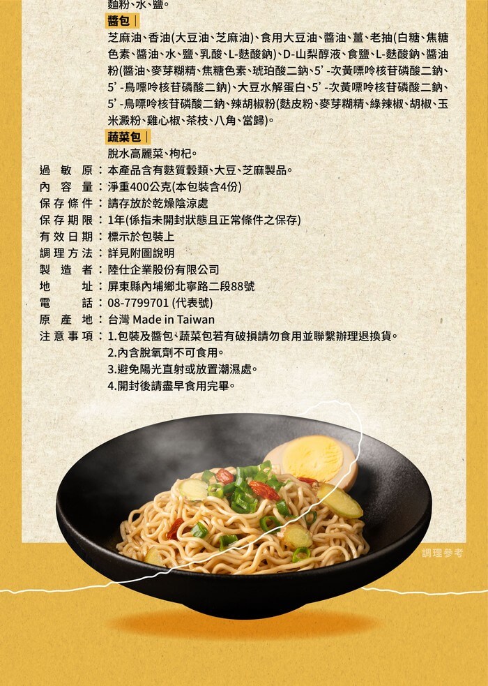 - 主商品尺寸/規格/重量:品名:【陸仕麵館】兩雙筷子|麻油薑汁乾拌麵 內容量:4入*3袋 原產地:台灣 保存期限:12個月(未開封狀態且正常條件之保存) 製造廠商或國內負責廠商名稱:陸仕企業股份有限公司 製造廠商或國內負責廠商電話:07-322-9435 製造廠商或國內負責廠商地址:屏東縣內埔鄉北寧路二段88號 投保產品責任險字號:131014AKP0000012 食品業者登錄字號:T-183414913-00000-0