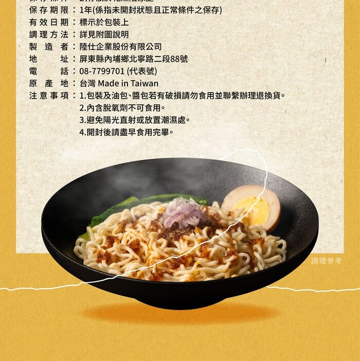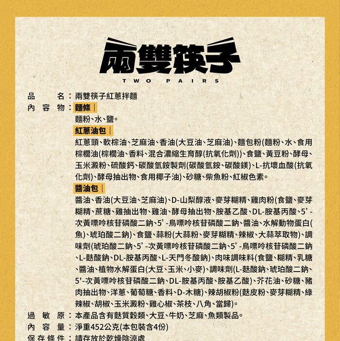 - 主商品尺寸/規格/重量:品名:【陸仕麵館】兩雙筷子|紅蔥乾拌麵 內容量:4入*2袋 原產地:台灣 保存期限:12個月(未開封狀態且正常條件之保存) 製造廠商或國內負責廠商名稱:陸仕企業股份有限公司 製造廠商或國內負責廠商電話:07-322-9435 製造廠商或國內負責廠商地址:屏東縣內埔鄉北寧路二段88號 投保產品責任險字號:131014AKP0000012 食品業者登錄字號:T-183414913-00000-0