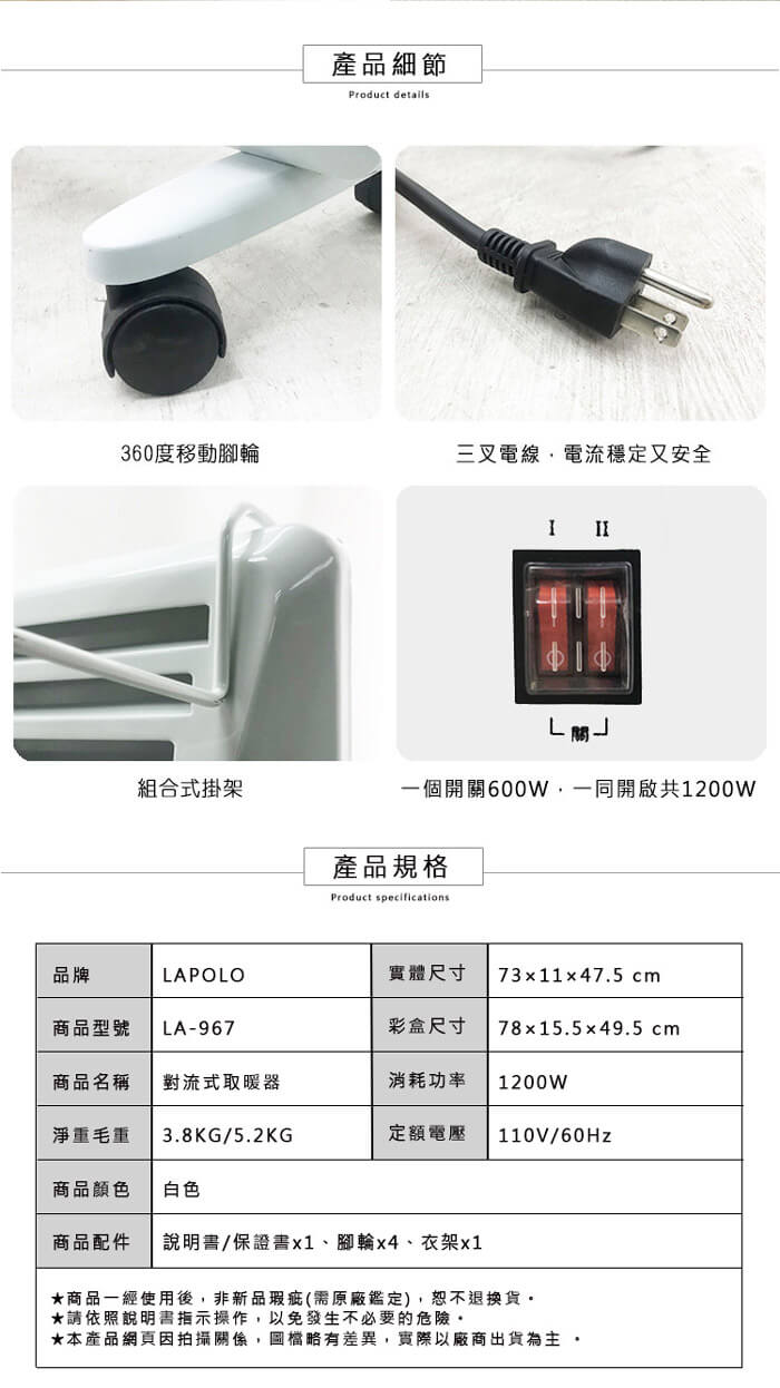 - 主商品:【LAPOLO】防潑水直立壁掛兩用對流式電暖器LA-967