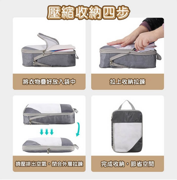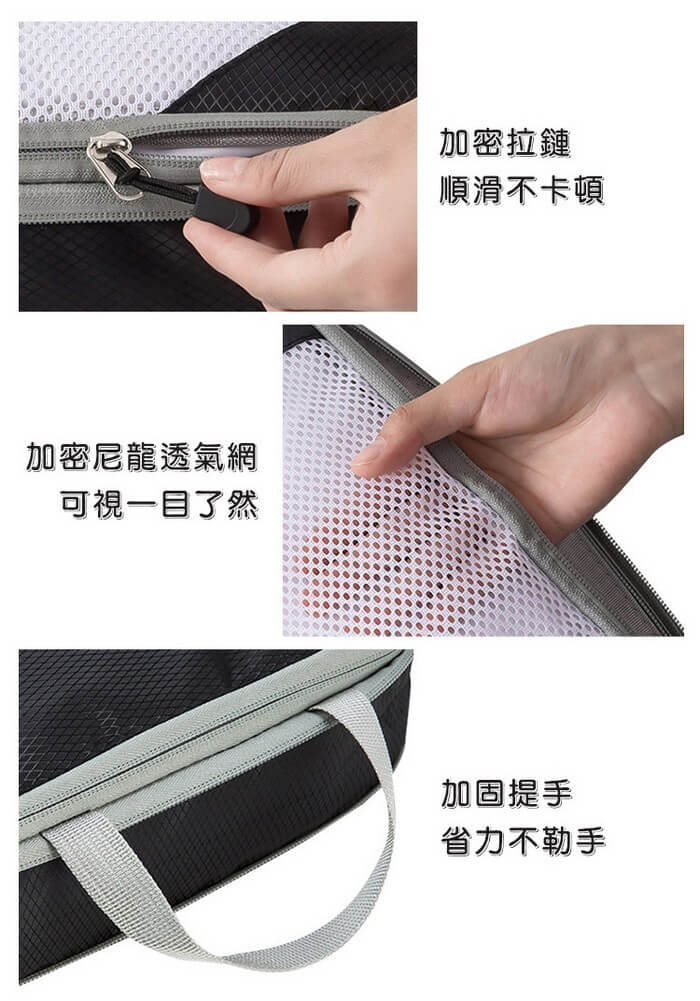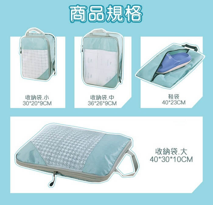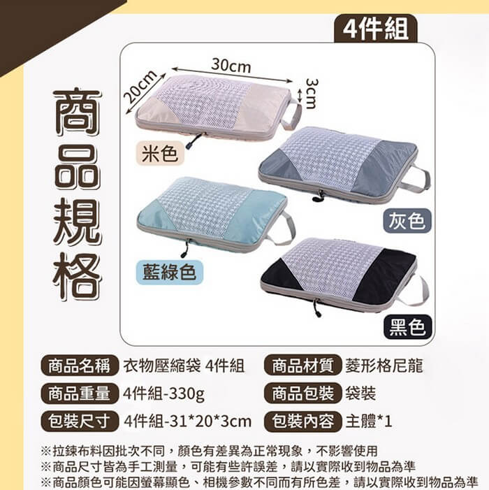 - 主商品尺寸/規格/重量/密度:品名 : 韓式升級質感加厚衣物4件組大容量壓縮袋(F款) 顏色 : 灰色、米色、黑色、藍綠色 商品材質:菱形格尼龍 商品尺寸:31x20x3cm (各類尺寸請參考圖示) 商品重量:總重330g 產地:中國
