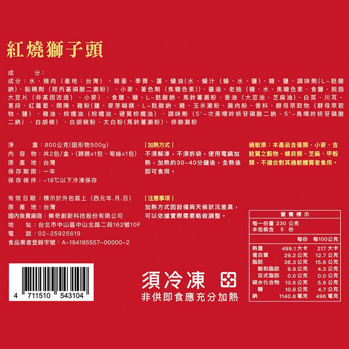 - 主商品尺寸/規格/重量:品名:【台北晶華酒店】紅燒獅子頭-800g(固形物500g) 內容物名稱:【台北晶華酒店】紅燒獅子頭-800g(固形物500g) 內容量:800g(固形物500g)/盒 原產地:台灣 保存期限:冷凍 12個月 製造廠商或國內負責廠商名稱: 樂奇創新科技股份有限公司 製造廠商或國內負責廠商電話:02-2592-5619 製造廠商或國內負責廠商地址: 104027 台北市中山區中山北路二段162號10樓 投保產品責任險字號:明台產物保險:0803-14PDT00874號 食品業者登錄字號:A-194185557-00000-2