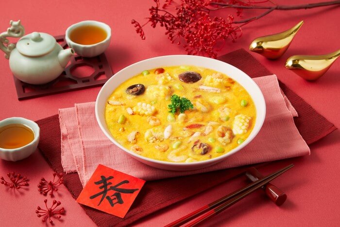 - 材質/食材:干貝米糕:水、糯米、臘腸【豬肉(原產地:台灣)、豬腸衣(原產地:西班牙)、糖、鹽、高粱酒(高粱、小麥)、L-麩酸鈉、食用紅色六號、亞硝酸鈉】、肝腸【豬肉(原產地:台灣)、鴨肝、豬腸衣(原產地:西班牙)、糖、鹽、高粱酒(高粱、小麥)、L-麩酸鈉、醬油、亞硝酸鈉】、干貝、豬肉(產地:台灣)、香菇絲、醬油、油蔥酥(豬油(產地:台灣)、紅蔥頭)、蝦仁、米酒(米、蔗糖、純水)、大豆沙拉油、砂糖、香油(芝麻油、大豆沙拉油)、食鹽、L-麩酸鈉、白胡椒粉。 海鮮煲:水、雞高湯(水、雞骨、糖、鹽、L-麩酸鈉)、鰹魚調味料【調味劑(L-麩酸鈉、5'-次黃嘌呤核苷磷酸二鈉、琥珀酸二鈉)、食鹽、乳糖、砂糖、乾燻鰹魚、鰹魚抽出物、酵母抽出物、D-木糖、麥芽糖、葡萄糖、糊精】、蝦仁、花枝、珠貝、蟹管肉、紅蘿蔔、大豆沙拉油、珍珠菇、小冬菇、毛豆仁、金沙鹹蛋風味粉(蛋黃粉、奶精(硬質棕櫚油、棕櫚油、葡萄糖漿、乳清蛋白、麥芽糊精、酪蛋白鈉、乳糖、麵粉、檸檬酸鉀、乳酸、脂肪酸甘油酯)、全蛋粉、麥芽糊精、酵母萃取物(酵母萃取物、鹽)、香料、紅椒色素(芥花油、辣椒萃取物)、β-胡蘿蔔素[麥芽糊精、辛烯基丁二酸鈉澱粉、葵花油、抗氧化劑(L-抗壞血酸鈉、維生素C、維生素E)、β-胡蘿蔔素])、馬鈴薯粉。
