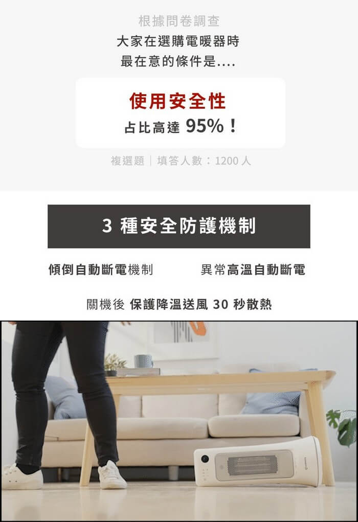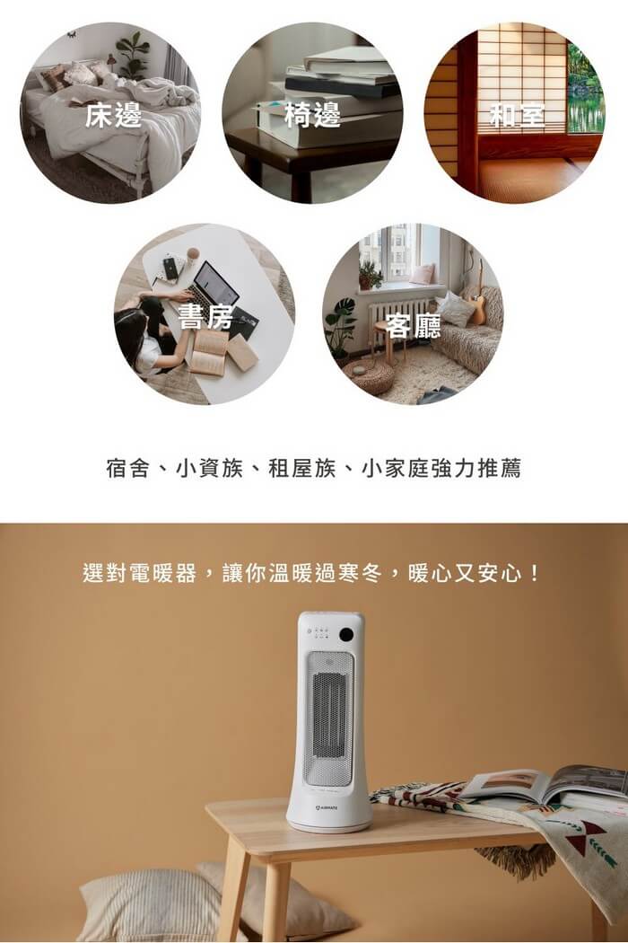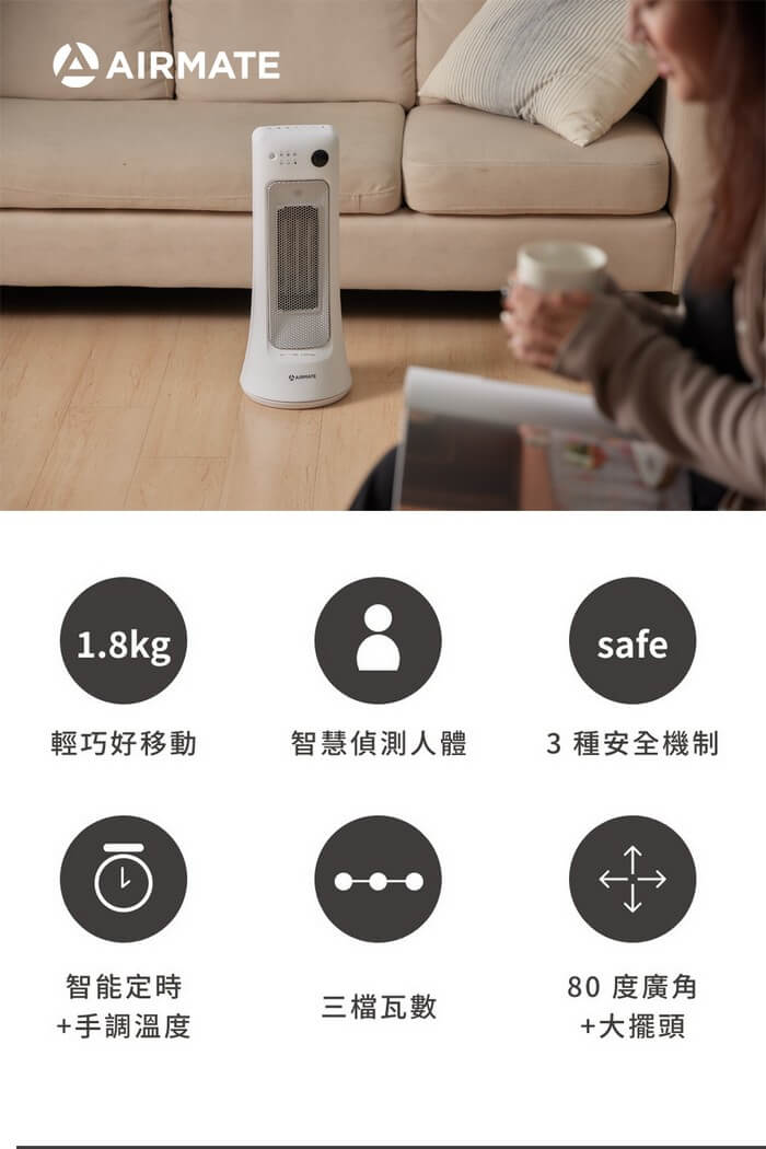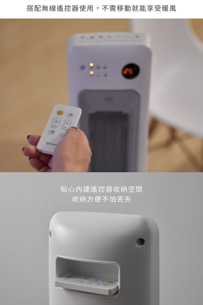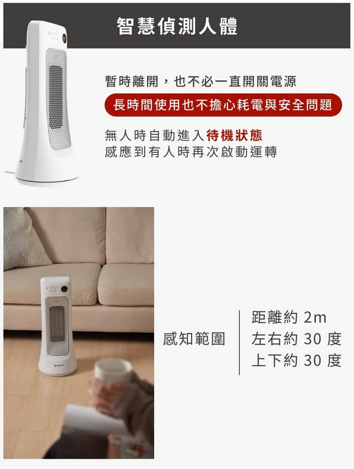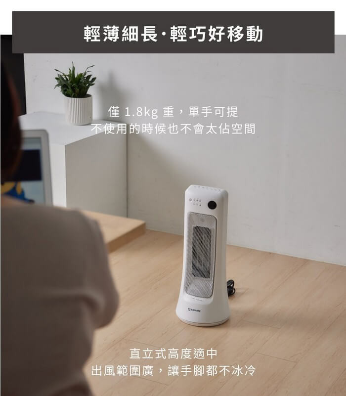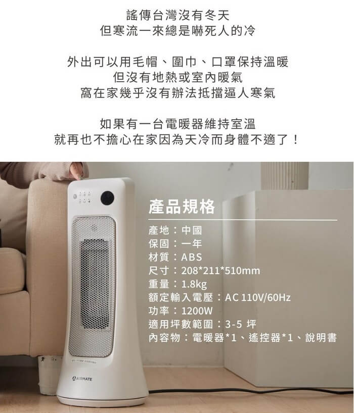 - 主商品尺寸/規格/重量:產品名稱:人體感知遙控陶瓷直立電暖器 產品型號:HP12109R 保固:一年 材質:ABS 尺寸:208*211*510mm 重量:1.8kg 額定輸入電壓:AC110V/60Hz 功率:1200W 內容物:電暖器*1、遙控器*1、說明書 ※電池為附贈品非遙控器內標準配備,如電量異常可自行購買更換 ※0-12歲孩童,請於成人監護下使用 ※詳細注意事項請看說明書,產品圖片僅供示意,詳細內容物及操作以實物為主。 ※本展品搖晃產生的聲音為主機內部防傾倒裝置因內部感應球移動所發出聲響,屬正常現象,請安心使用。