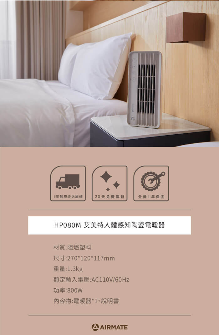 - 主商品尺寸/規格/重量:產品名稱:人體感知陶瓷電暖器 產品型號:HP080M 材質:阻燃塑料 尺寸:270*120*117mm 重量:1.3kg 額定輸入電壓:AC110V/60Hz 功率:800W 內容物:電暖器*1、說明書 ※0-12歲孩童,請於成人監護下使用 ※詳細注意事項請看說明書,產品圖片僅供示意,詳細內容物及操作以實物為主。 ※本展品搖晃產生的聲音為主機內部防傾倒裝置因內部感應球移動所發出聲響,屬正常現象,請安心使用。