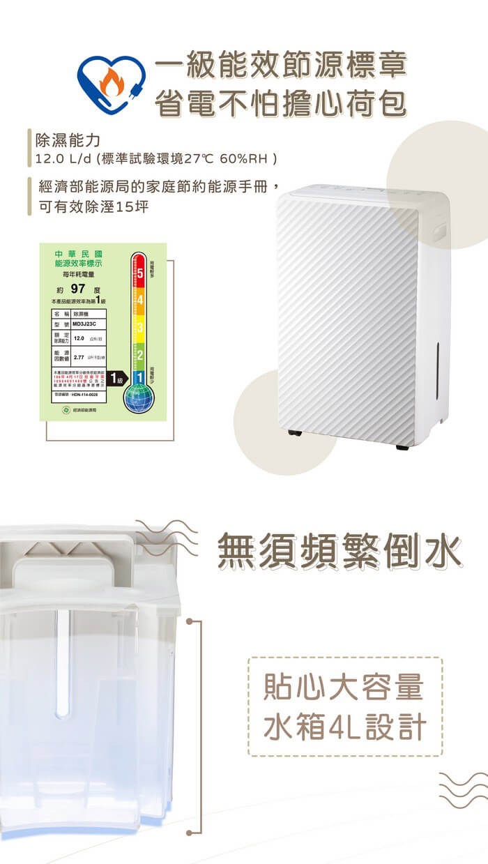 除濕能力:12.0 L/d (標準試驗環境27℃ 60%RH )。