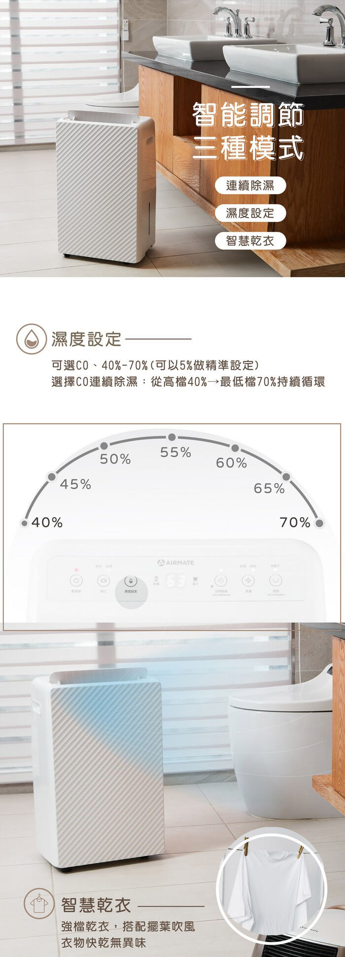 智能調節三種模式:連續除濕/濕度設定/智慧乾衣。