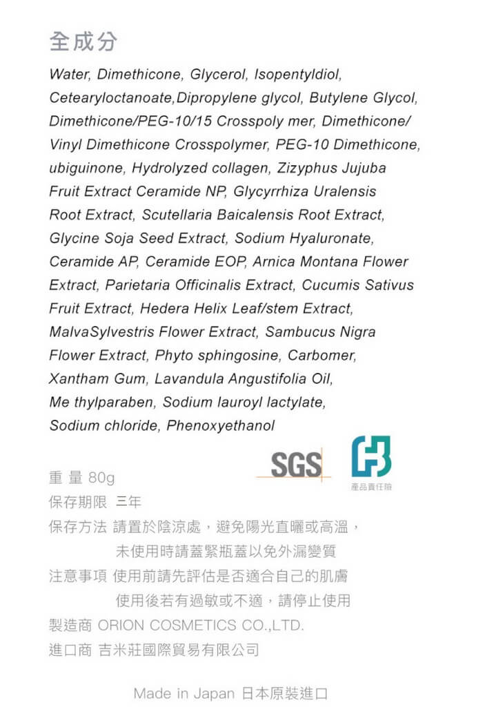- 主商品尺寸/規格/重量:重 量: 80g 製造日期: 2025.05 保存期限: 三年 批號:如外盒標示 使用方法: 洗完臉後,取適量塗於整個臉部。 對於需要加強的區域和乾性皮膚,可多使用 保存方法: 請置於陰涼處,避免陽光直曬或高溫,未使用時請蓋緊瓶蓋以免外漏變質 注意事項: 使用前請先評估是否適合自己的肌膚,使用後若有過敏或不適請停止使用 製造商: ORION COSMETICS CO.,LTD. 進口商: 吉米莊國際貿易有限公司 地 址: 臺中市西屯區華美西街二段311號8樓之二 電 話: +886 423168818 原產地: 日本 Made in Japan