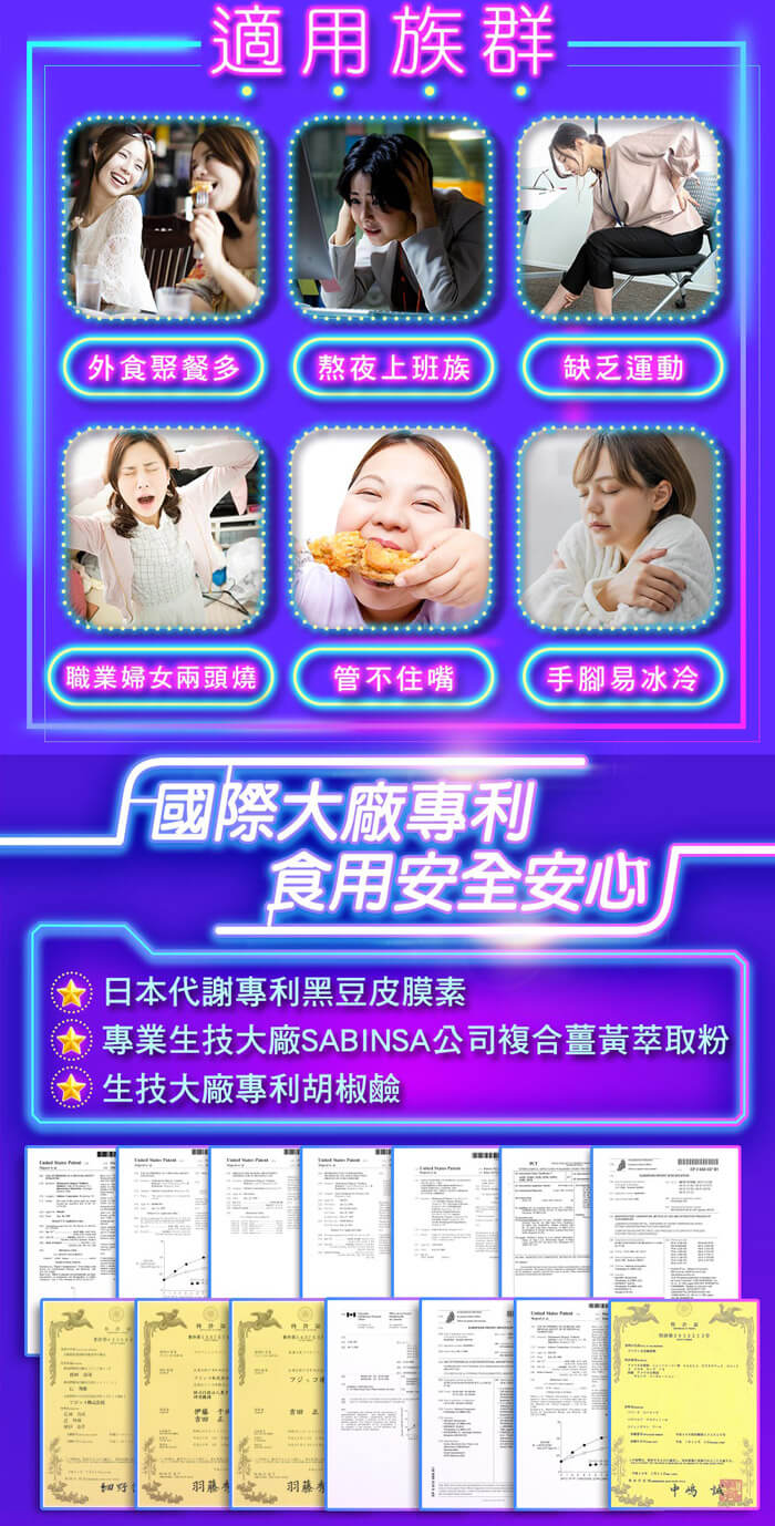 - 材質/食材:成分: 乳糖、複合薑萃取粉(薑母粉、專利複合薑黃抽出物)、阿拉伯膠、複合胡椒萃取粉(白胡椒精粉、黑胡椒精粉、專利胡椒鹼)、咖啡粉、硬脂酸鎂、綠茶萃取粉(含兒茶素)、葡萄籽萃取粉、食用黃色四號鋁麗基、專利黑豆皮膜素(黑豆種皮抽出物、糊精)、羧甲基纖維素鈉、牛蒡萃取粉(牛蒡、麥芽糊精)