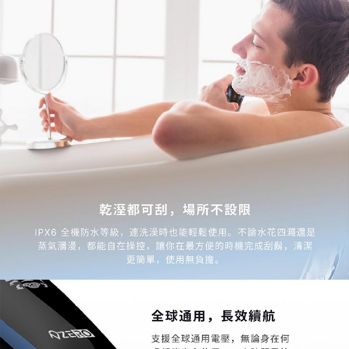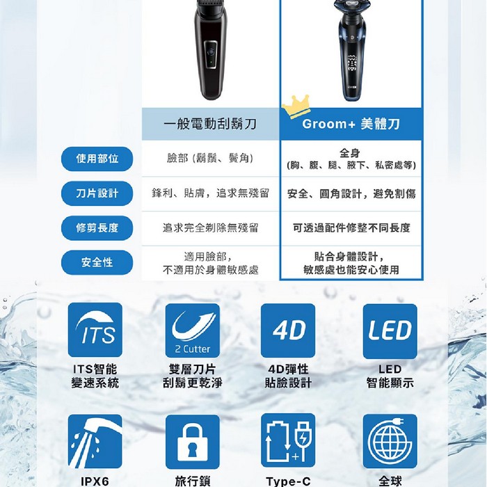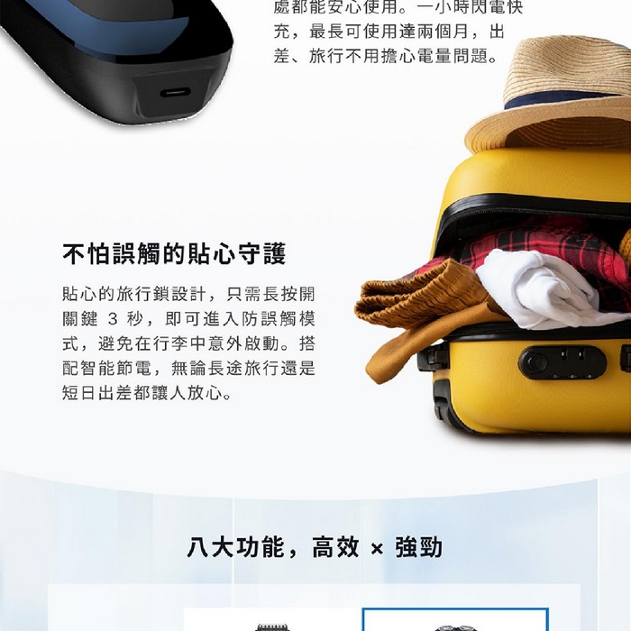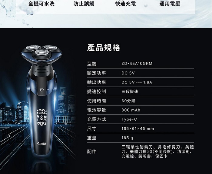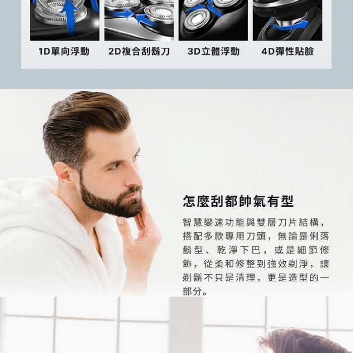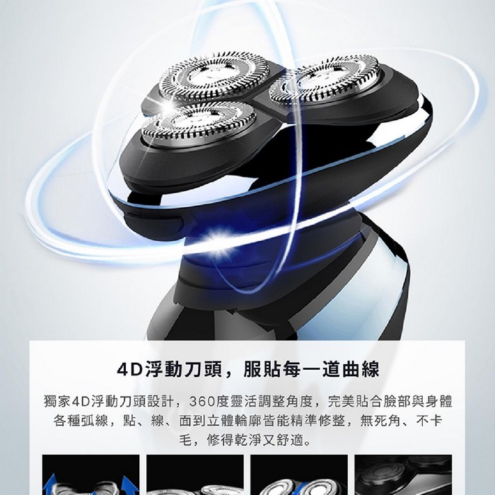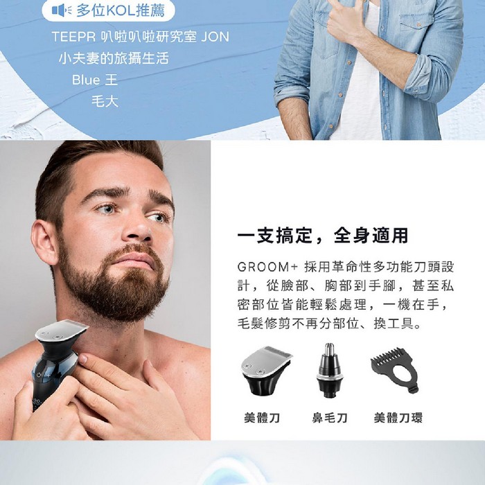 - 配件:三環柔性刮鬍刀、鼻毛修剪刀、美體刀、美體刀環×3(不同長度)、清潔刷、充電線、說明書、保固卡