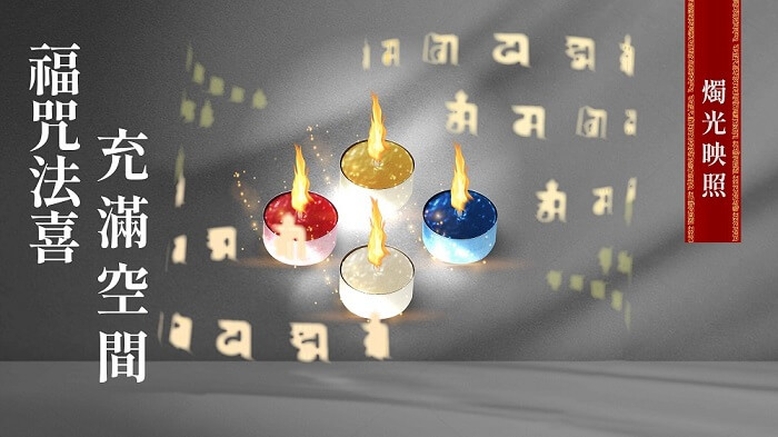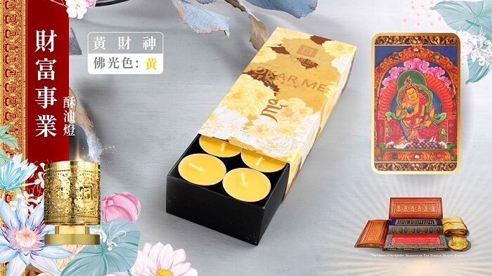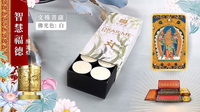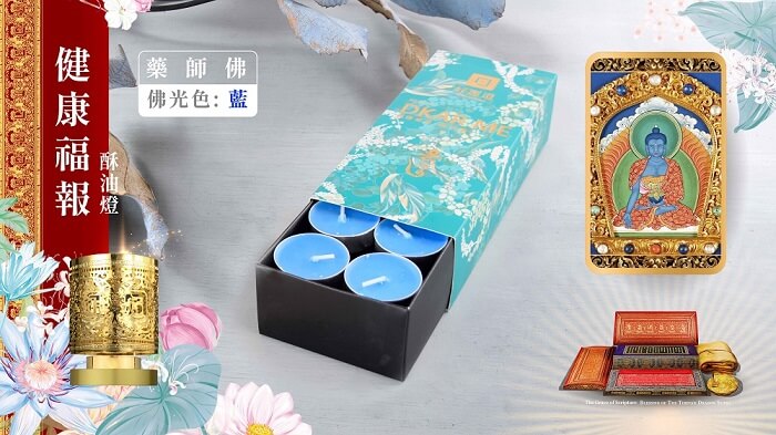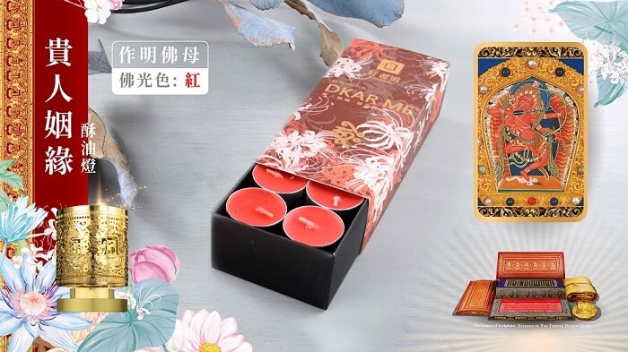 - 贈品顏色:十字金剛杵轉經輪:鍍金色 酥油燭:(白、黃、紅、藍 各1)