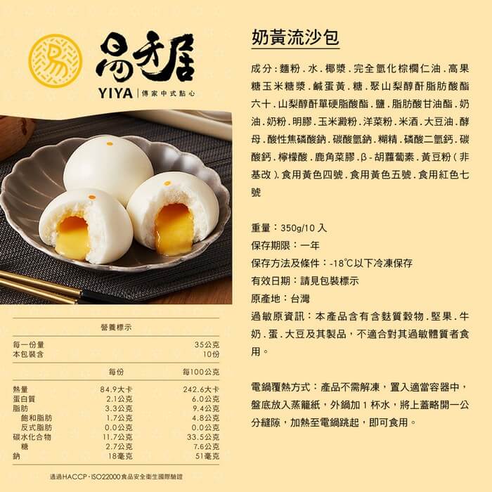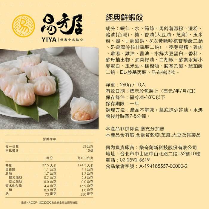- 主商品尺寸/規格/重量:品名:【易牙居】招牌港點3件組 內容物名稱:經典鮮蝦餃+奶黃流沙包+蜜汁叉燒酥/各一包 內容量:下列各一包: 【易牙居】經典鮮蝦餃-10入:260g(10入)/盒 【易牙居】奶黃流沙包-10入:350g(10入)/盒 【易牙居】蜜汁叉燒酥-6入:318g(6入)/盒 原產地:台灣 保存期限:冷凍 12個月 製造廠商或國內負責廠商名稱: 樂奇創新科技股份有限公司 製造廠商或國內負責廠商電話:02-2592-5619 製造廠商或國內負責廠商地址: 104027 台北市中山區中山北路二段162號10樓 投保產品責任險字號:明台產物保險:0803-14PDT00874號 食品業者登錄字號:A-194185557-00000-2