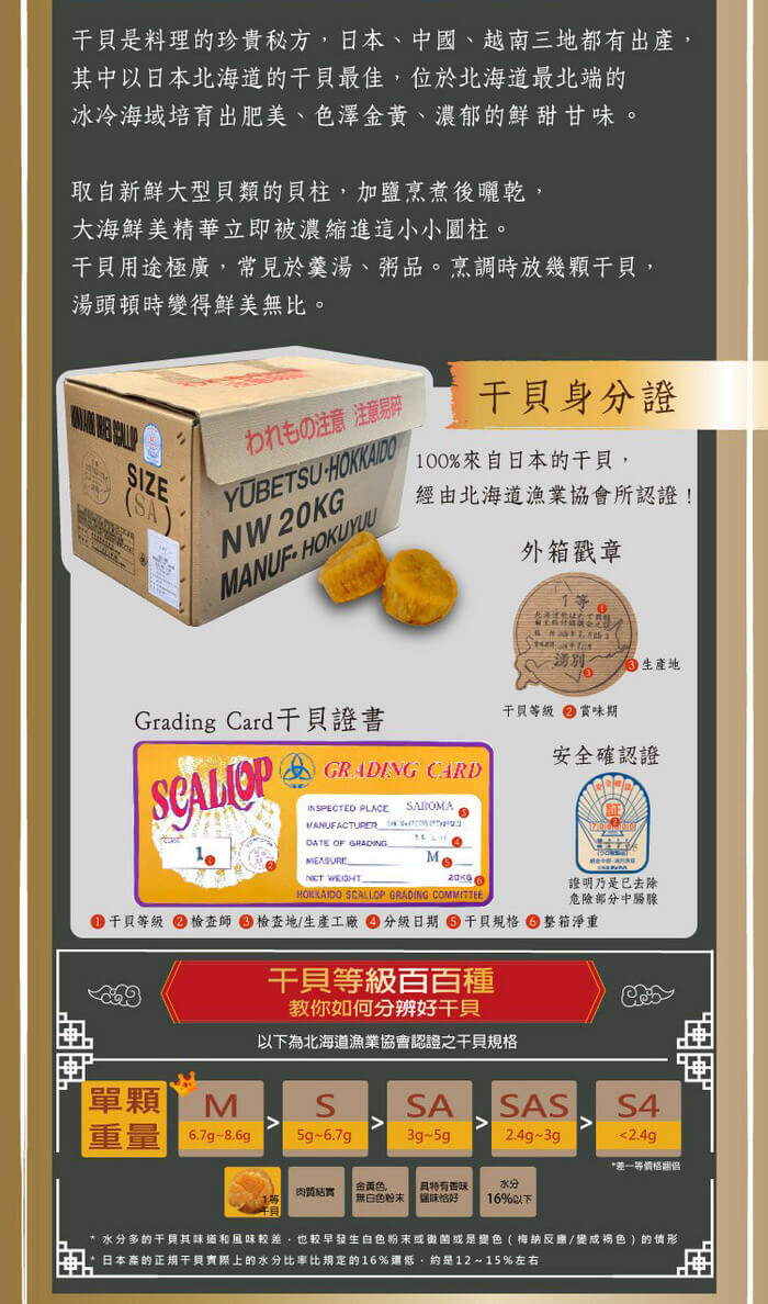 - 主商品尺寸/規格/重量:品名: 【十翼饌】富貴有餘干貝烏魚子禮盒 內容物名稱:台灣六兩烏魚子 1片、台灣大香菇 75g、北海道M號干貝 135g 原產地: 台灣、日本 保存期限:烏魚子:常溫7天 冷凍1年,干貝、香菇:1年 製造廠商或國內負責廠商名稱:美大雅有限公司 製造廠商或國內負責廠商電話:02-27270855 製造廠商或國內負責廠商地址:10491台北市中山區建國北路二段3巷15號9樓之1 投保產品責任險字號:南山產物保險22A0058919 食品業者登錄字號:D-197490088-00000-6