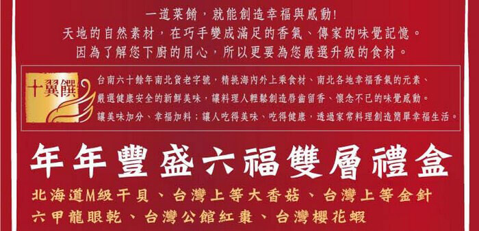 - 主商品:【十翼饌】年年豐盛六福雙層禮盒 (附提袋)
