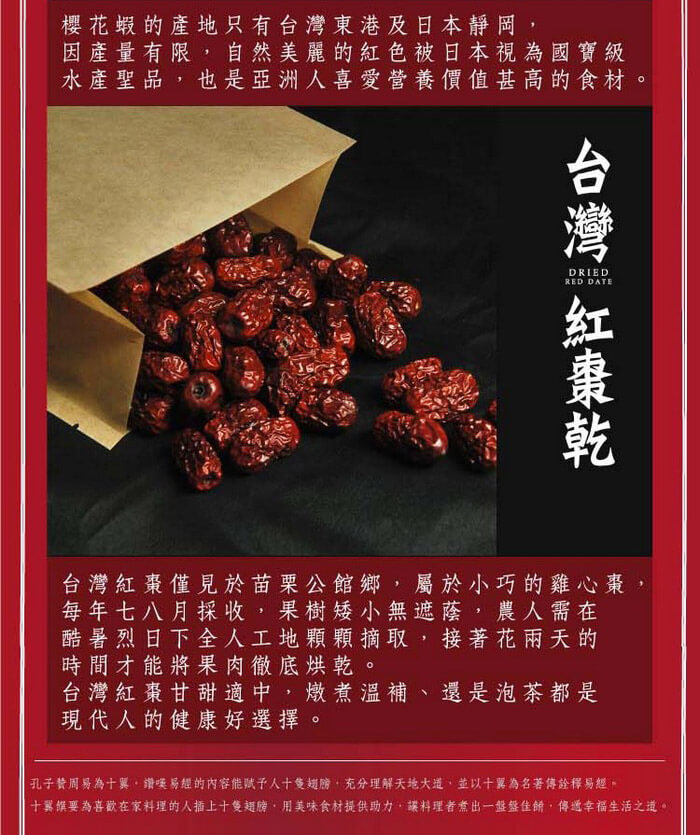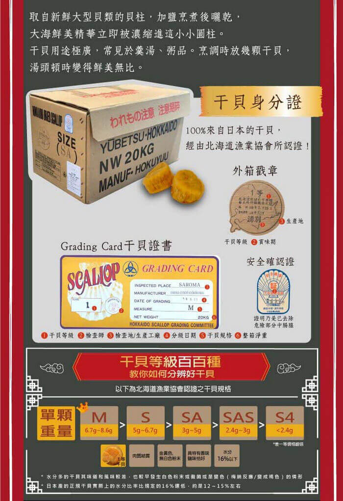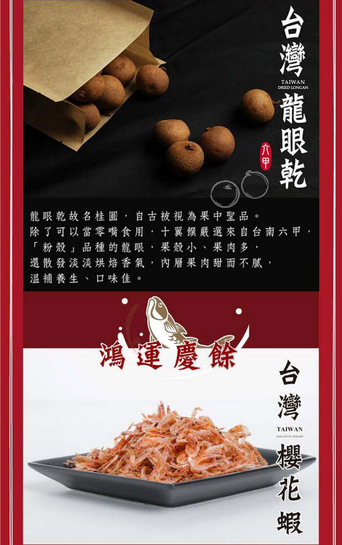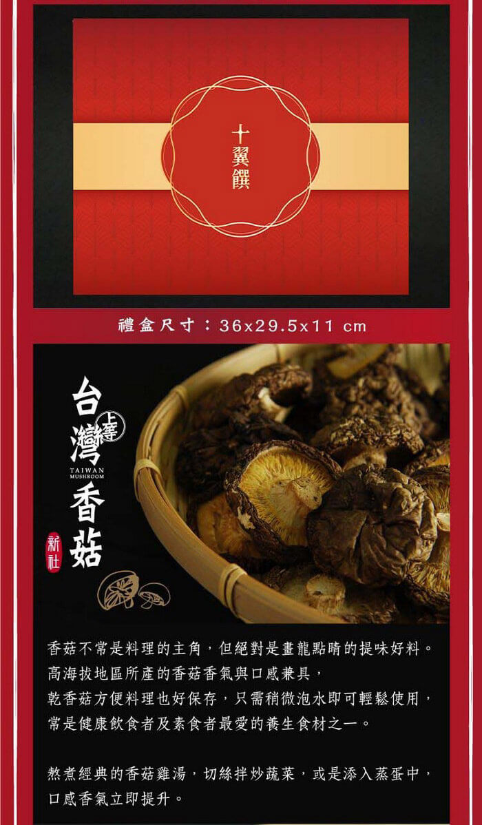 - 主商品尺寸/規格/重量:品名: 【十翼饌】年年豐盛六福雙層禮盒 內容物名稱:M級北海道干貝 135g、台灣大香菇 120g、台灣上等金針 35g、台灣龍眼乾 130g、台灣紅棗 150g、台灣櫻花蝦 50g 原產地: 台灣、日本 保存期限:干貝、香菇、金針、紅棗:1年,龍眼乾、櫻花蝦:6個月 製造廠商或國內負責廠商名稱:美大雅有限公司 製造廠商或國內負責廠商電話:02-27270855 製造廠商或國內負責廠商地址:10491台北市中山區建國北路二段3巷15號9樓之1 投保產品責任險字號:南山產物保險22A0058919 食品業者登錄字號:D-197490088-00000-6