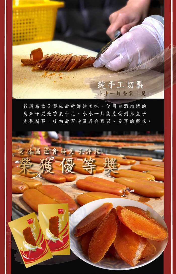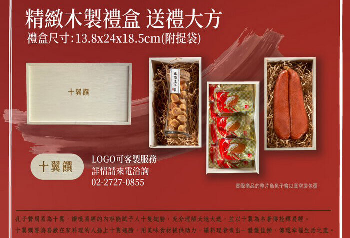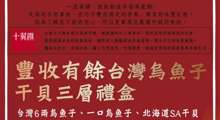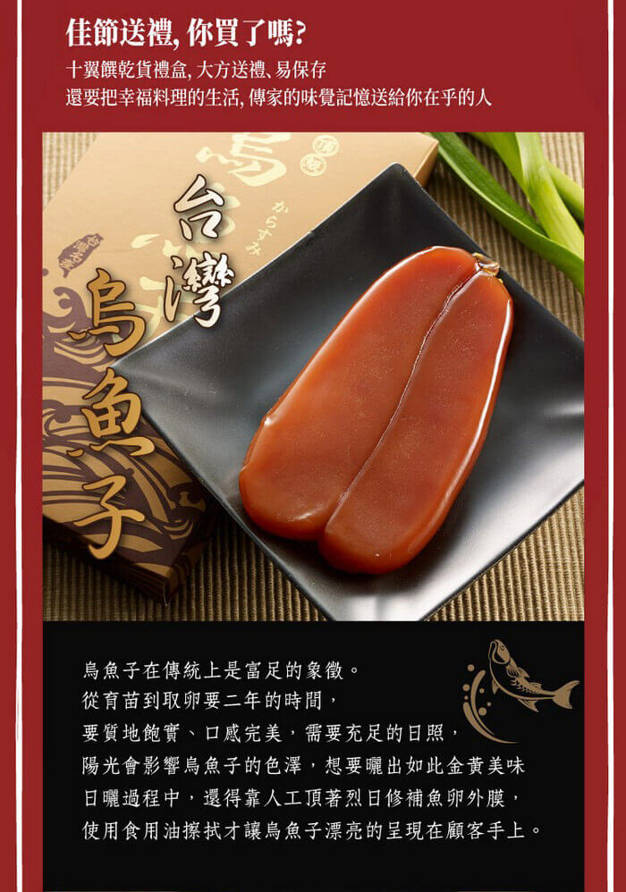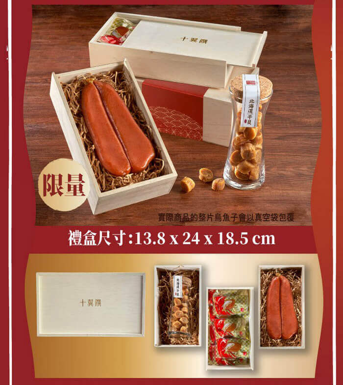 - 主商品:【十翼饌】豐收有餘烏魚子+干貝3層 (附提袋)