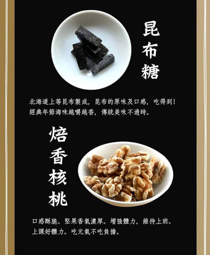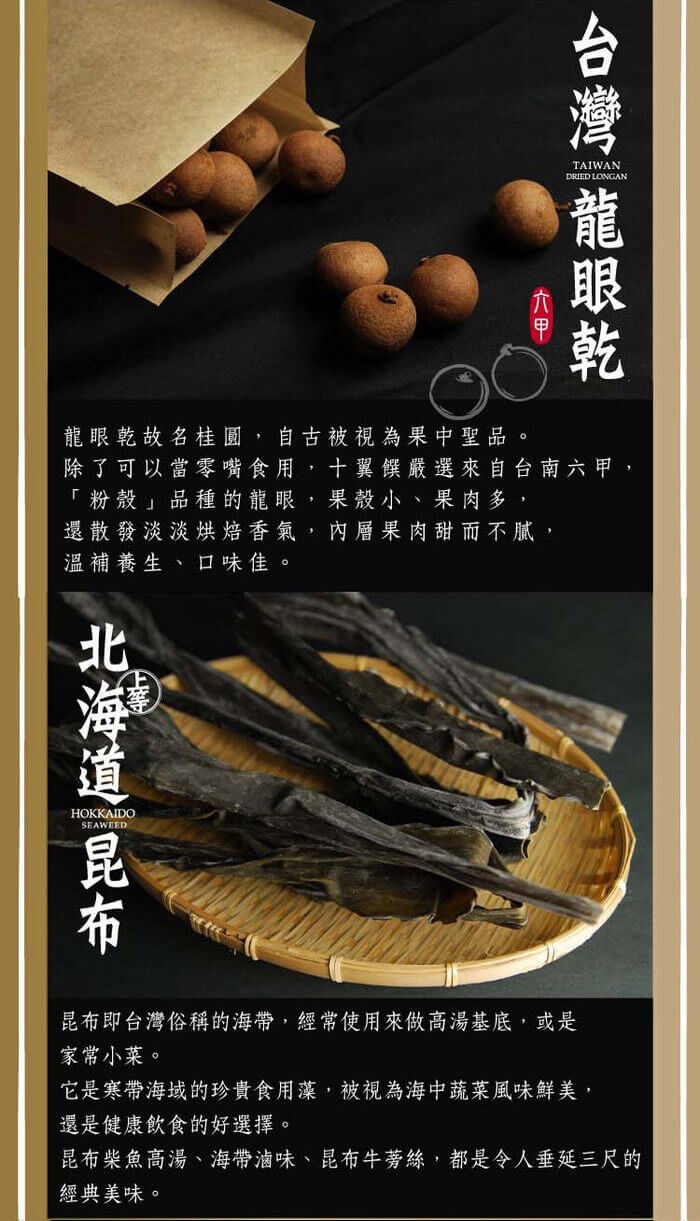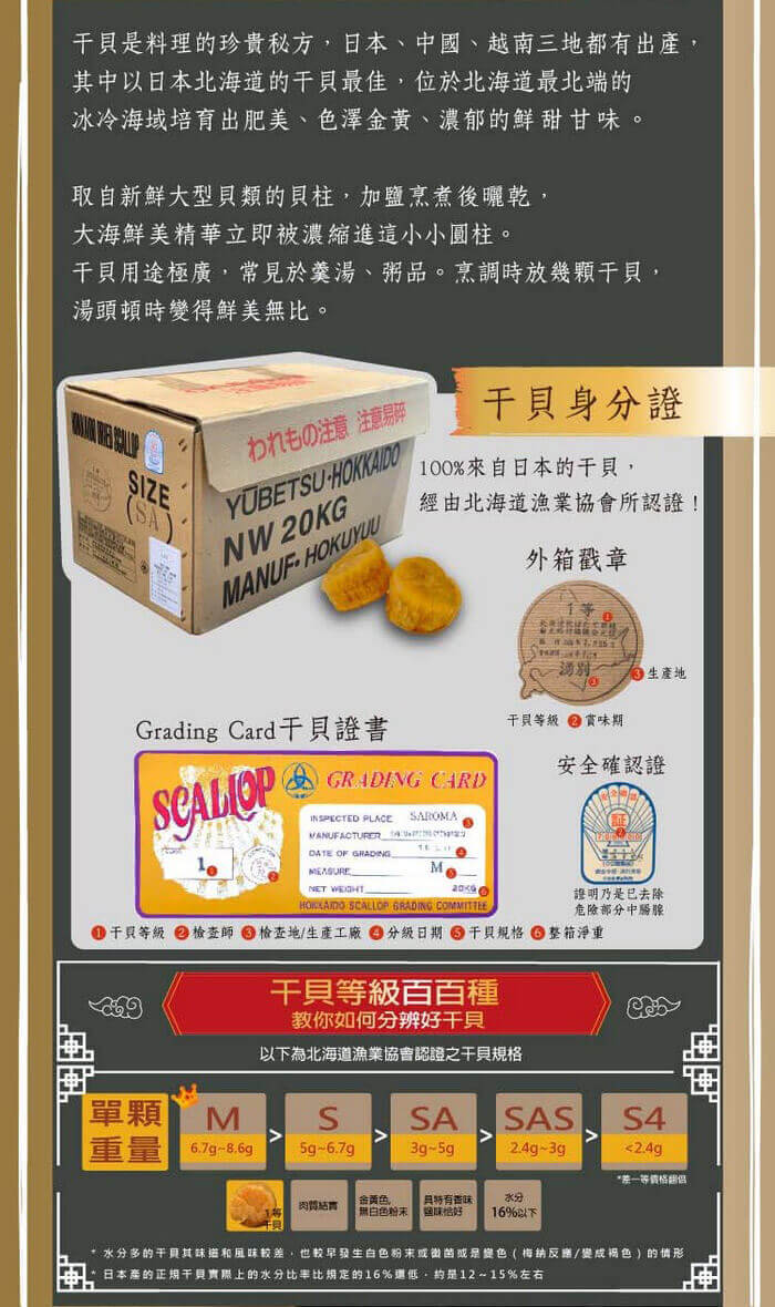 - 主商品尺寸/規格/重量:品名: 【十翼饌】富貴大發干貝香菇八巧禮盒 內容物名稱:S級北海道干貝18顆 100g、台灣大香菇 75g 、台灣龍眼乾 180g、北海道昆布 120g、昆布糖120g、焙香核桃110g、核桃棗泥糕 130g (12顆)、黑芝麻糕130g (12顆) 原產地: 台灣、日本 保存期限:干貝、香菇、昆布、昆布糖:1年,龍眼乾、焙香核桃:6個月,棗泥糕、黑芝麻糕:4個月 製造廠商或國內負責廠商名稱:美大雅有限公司 製造廠商或國內負責廠商電話:02-27270855 製造廠商或國內負責廠商地址:10491台北市中山區建國北路二段3巷15號9樓之1 投保產品責任險字號:南山產物保險22A0058919 食品業者登錄字號:D-197490088-00000-6