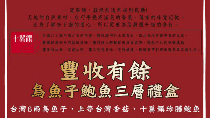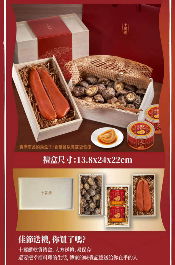 - 主商品:【十翼饌】豐收有餘烏魚子鮑魚三層禮盒(附提袋)