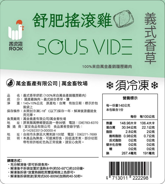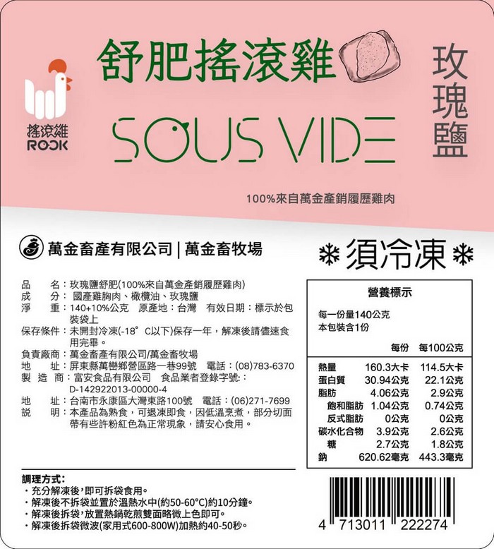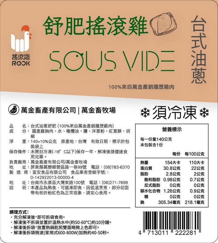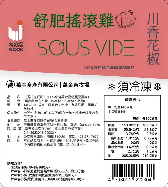 - 主商品尺寸/規格/重量:品名: 搖滾雞舒肥雞胸 內容物名稱: 舒肥雞胸肉 (玫瑰鹽 / 台式油蔥 / 義式香草/ 川香花椒) 內容量: 140g/1入裝 原產地: 台灣 保存期限: 未開封冷凍(-18度C以下)保存一年,解凍後請盡速食用完畢。 製造廠商或國內負責廠商名稱:萬金畜牧場 製造廠商或國內負責廠商電話:08-7836370 製造廠商或國內負責廠商地址:屏東縣萬巒鄉營區路一巷99號 投保產品責任險字號:0206第14PDL00101號 食品業者登錄字號:T-156704924-00000-4 建議調理方式: 充分解凍後,即可拆袋食用。 解凍後拆袋,放置熱鍋乾煎雙面略微上色即可。 解凍後拆袋微波(家用式600-800W)加熱40-50秒。