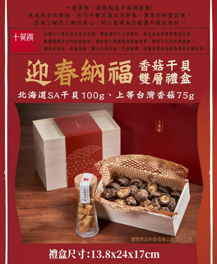 - 主商品:【十翼饌】迎春納福香菇干貝雙層禮盒 (附提袋)
