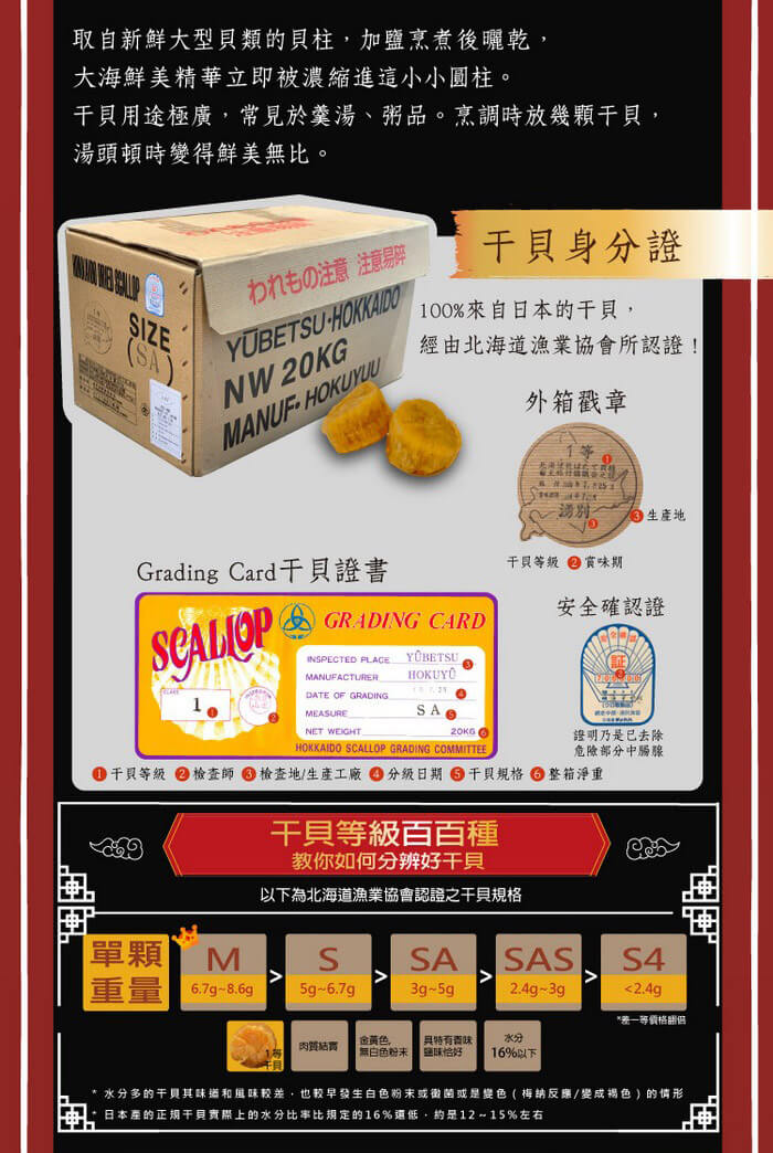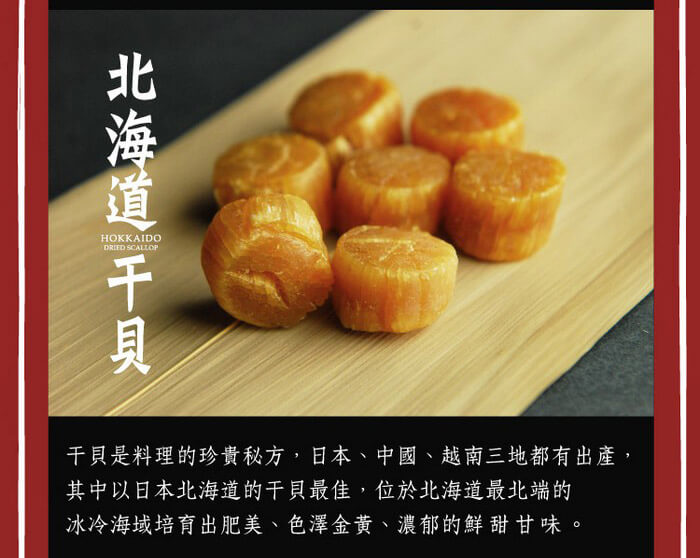 - 主商品尺寸/規格/重量:品名: 【十翼饌】迎春納福香菇干貝雙層禮盒 內容物名稱:北海道SA干貝100g、台灣香菇75g 原產地: 日本、台灣 保存期限:1年 。 製造廠商或國內負責廠商名稱:美大雅有限公司 製造廠商或國內負責廠商電話:02-27270855 製造廠商或國內負責廠商地址:10491台北市中山區建國北路二段3巷15號9樓之1 投保產品責任險字號:南山產物保險22A0058919 食品業者登錄字號:D-197490088-00000-6