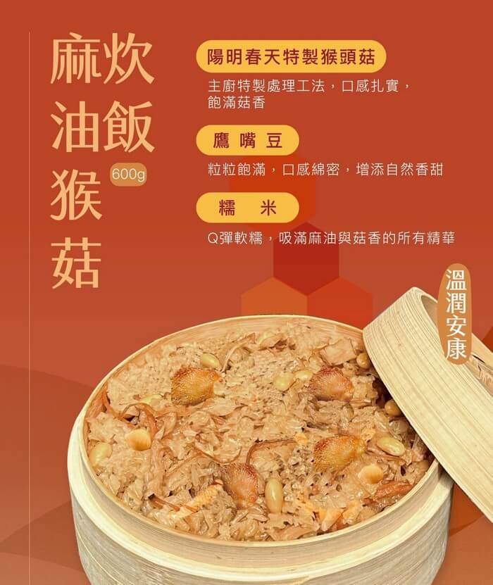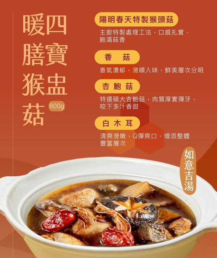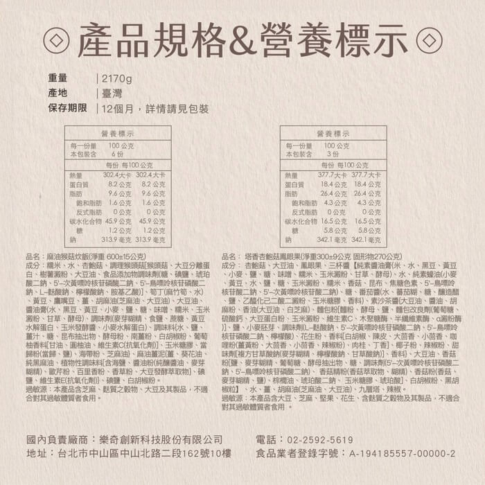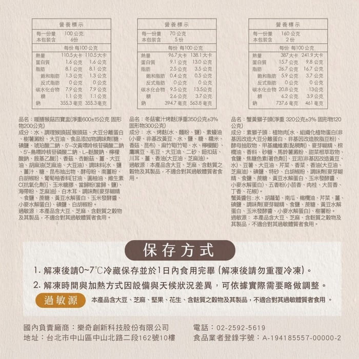 - 主商品尺寸/規格/重量:品名:【陽明春天】盈春迎福年菜組 內容物名稱:【陽明春天】盈春迎福年菜組 內容量:下列各一盒: 麻油猴菇炊飯600g/盒 暖膳猴菇四寶盅600g(固形物200g+湯底400g)/包 塔香杏鮑菇鳳眼果300g/包 冬菇蜜汁烤麩350g/包 蟹黃獅子頭320g(單包:1包醬1包料,獅子頭120g大約6-7顆) /包 原產地:台灣 保存期限:冷凍 12個月 製造廠商或國內負責廠商名稱: 樂奇創新科技股份有限公司 製造廠商或國內負責廠商電話:02-2592-5619 製造廠商或國內負責廠商地址: 104027 台北市中山區中山北路二段162號10樓 投保產品責任險字號:明台產物保險:0803-14PDT00874號 食品業者登錄字號:A-194185557-00000-2