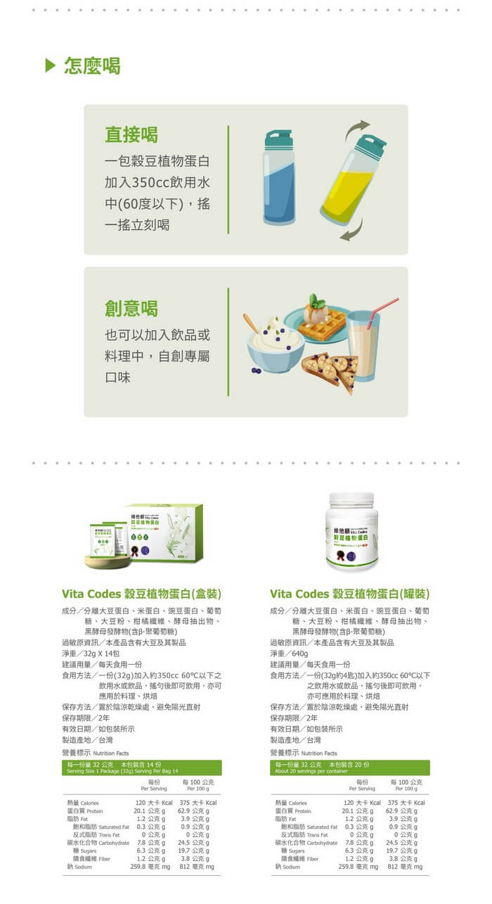- 主商品:維他顧 Vita Codes 穀豆植物蛋白(640g/罐)
