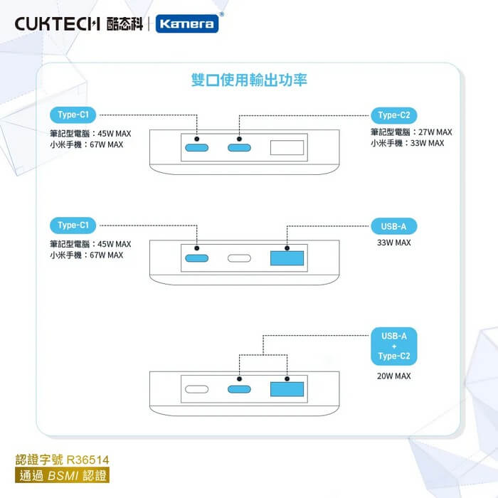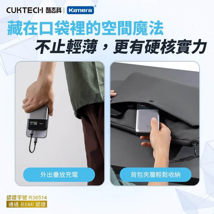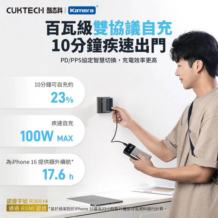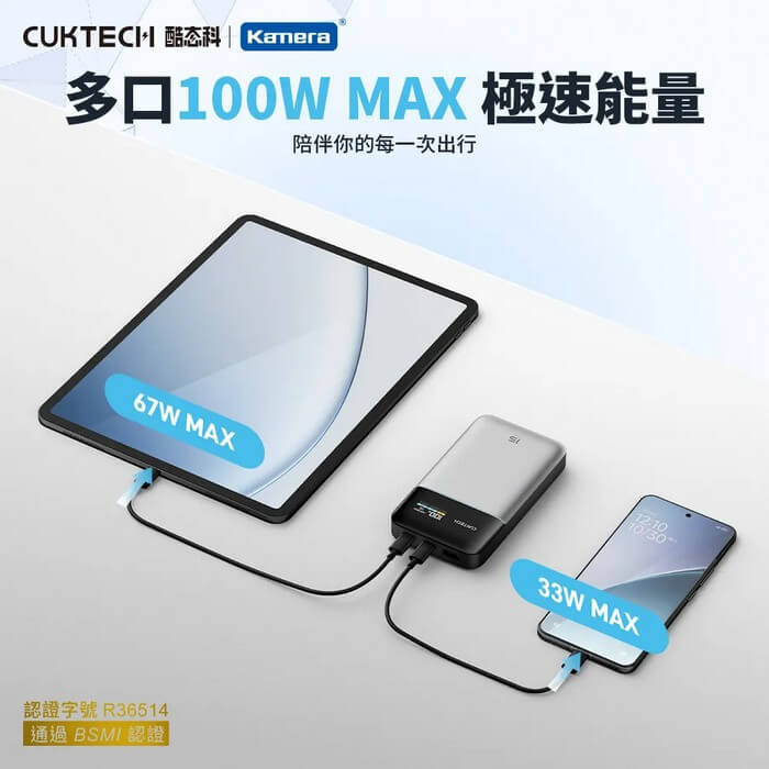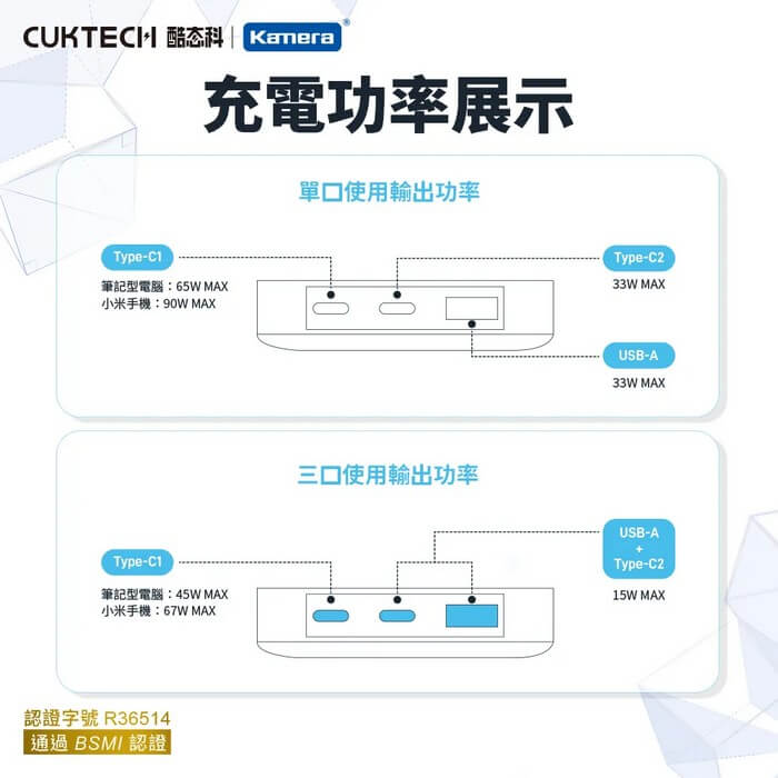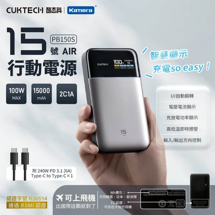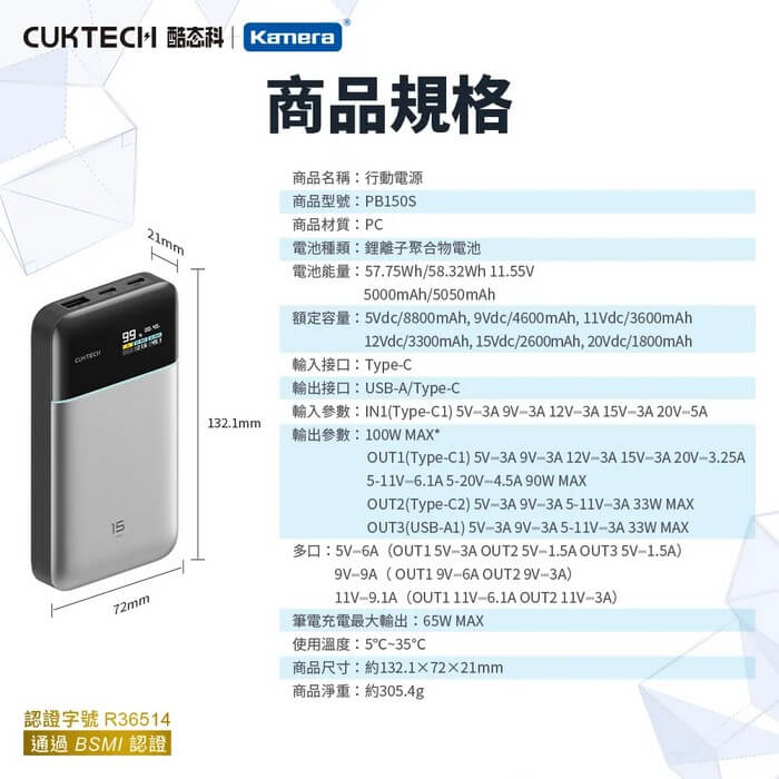 - 主商品尺寸/規格/重量/密度:品名:行動電源 型號:PB150S 顏色:鈦灰色 商品材質:PC 電池種類:鋰離子聚合物電池 電池能量:57.75Wh/58.32Wh 11.55V 5000mAh/5050mAh 額定容量:5Vdc/8800mAh, 9Vdc/4600mAh,11Vdc/3600mAh, 12Vdc/3300mAh, 15Vdc/2600mAh, 20Vdc/1800mAh 輸入接口:Type-C 輸出接口:USB-A/Type-C 輸入參數:IN1(Type-C1) 5V⎓3A 9V⎓3A 12V⎓3A 15V⎓3A 20V⎓5A 輸出參數:100W MAX* OUT1(Type-C1) 5V⎓3A 9V⎓3A 12V⎓3A 15V⎓3A 20V⎓3.25A 5-11V⎓6.1A 5-20V⎓4.5A 90W MAX OUT2(Type-C2) 5V⎓3A 9V⎓3A 5-11V⎓3A 33W MAX OUT3(USB-A1) 5V⎓3A 9V⎓3A 5-11V⎓3A 33W MAX 多 口:5V⎓6A(OUT1 5V⎓3A OUT2 5V⎓1.5A OUT3 5V⎓1.5A) 9V⎓9A(OUT1 9V⎓6A OUT2 9V⎓3A) 11V⎓9.1A(OUT1 11V⎓6.1A OUT2 11V⎓3A) 筆電充電最大輸出:65W MAX 使用溫度:5℃~35℃ 行動電源轉換效率:75.4%(5V⎓3A) 充電時間:約 1.5 小時(65W以上功率充電器,包裝內附 Type-C 轉Type-C 充電線,IN1接口) 約 4 小時(18W充電器,包裝內附充電線) 注意:Type-C 口輸出電流大於 3A 時,需要使用包裝內 Type-C 轉Type-C 充電線。 本商品充電功率大,推薦65W以上功率的充電器搭配包裝內充電線使用。 *峰值功率 100W Max(OUT1 (Type-C1) = 11 V/6.1 A + OUT2(Type-C2) = 11 V/3.0 A"), 持續滿功率拉載5分鐘後會主動降功率至55W OUT1(Type-C1) = 11 V/3 A + OUT2(Type-C2) = 11 V/2A") 邊充邊放參數: 1. C1 15V3A充電,C2/A口 11V3A放電 2. C1 15V3A充電, C2+A總功率5V3A放電 BSMI認證字號:R36514 商品尺寸:約132.1×72×21mm 包裝尺寸:約165×76×22mm 商品淨重:約305.4g 商品毛重:約364.4g 包裝內容:行動電源×1、充電線×1、使用說明書×1 備註:此賣場不含主機相關展示商品