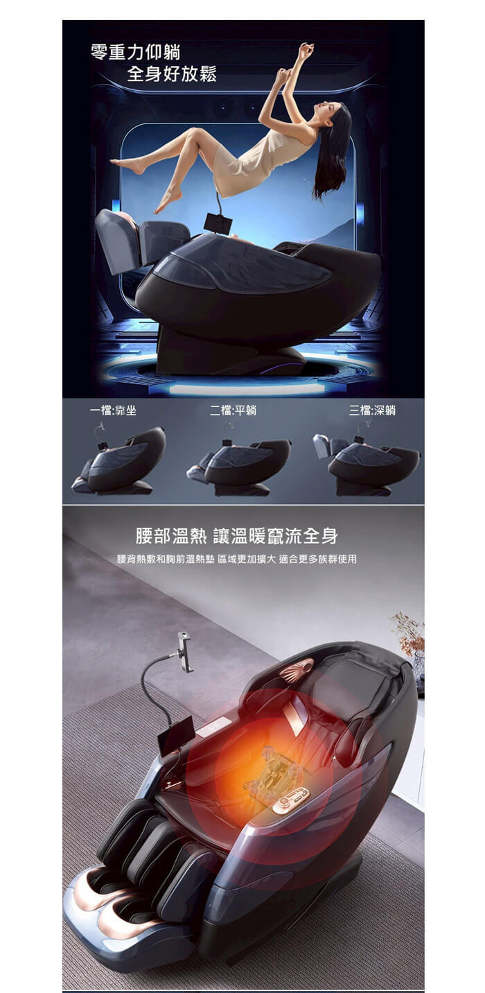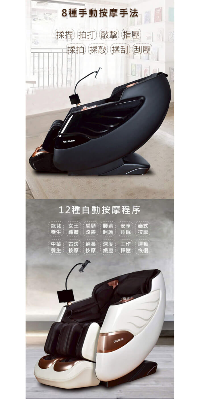 零重力三段式仰檔,12種自動按摩程序,8種手動模式。