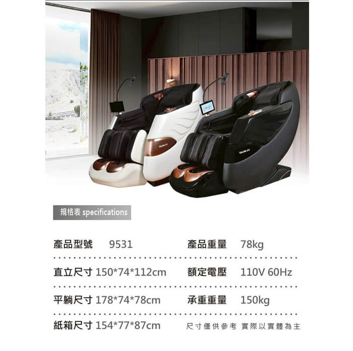 - 主商品尺寸/規格/重量/密度:直立 150*74*112公分 躺臥 178*74*78 公分 淨重:78kg 電源電壓:110V/60Hz