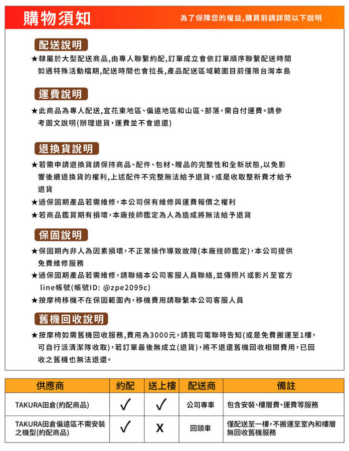 ◎針對大型商品(如大型家電、家具床墊、健身按摩器材、車類…等),因商品屬性關係,我們將於完成收款確認後,三個工作日內由專人與您確認送貨時間(可約定到貨日為下單日起90天內)及配送細節等。