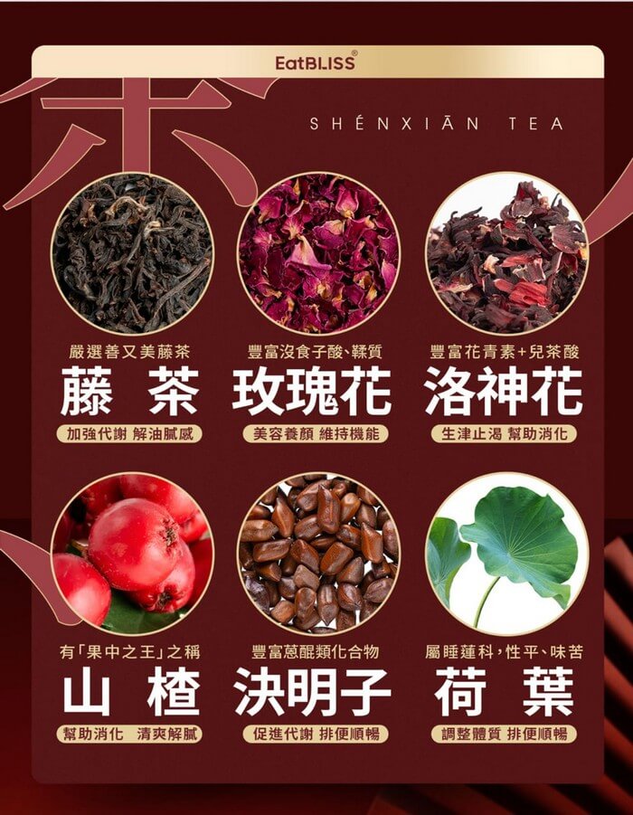 - 材質/食材:成分: 山楂、玫瑰花瓣、決明子、荷葉、甘草、陳皮、洛神花、藤茶、桑葉。