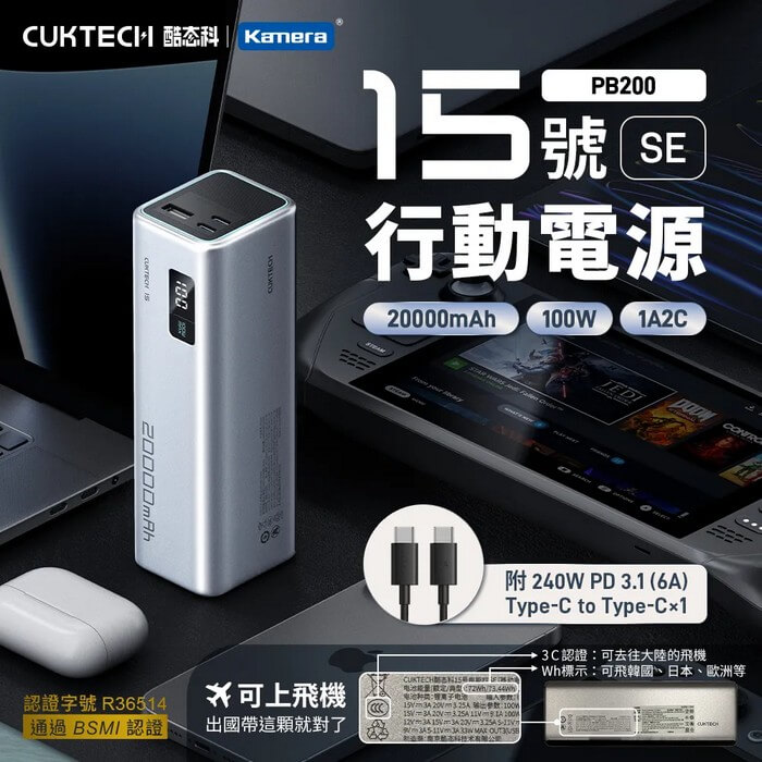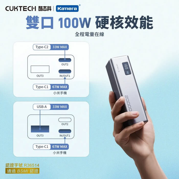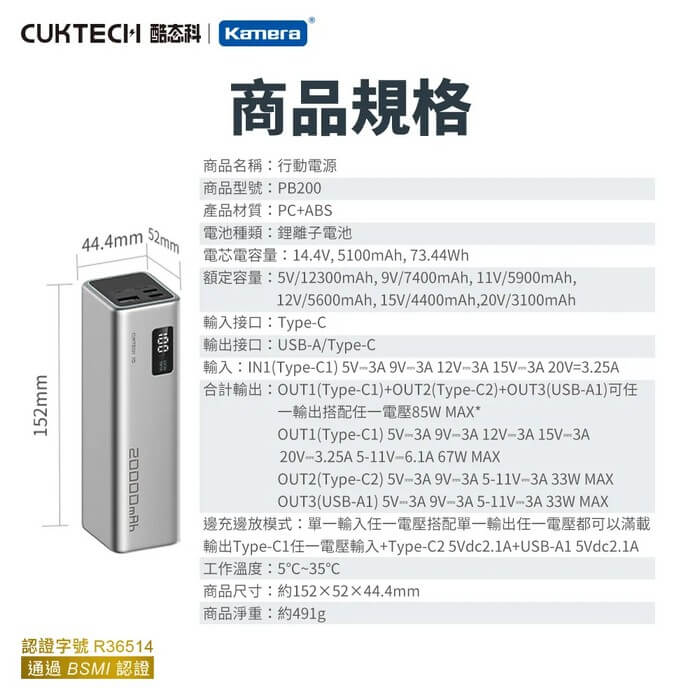 - 主商品尺寸/規格/重量/密度:商品品名:行動電源 商品型號:PB200 商品材質:PC+ABS 商品顏色:灰色 電池種類:鋰離子電池 電芯電容量:14.4V, 5100mAh, 73.44Wh 額定容量:5V/12300mAh, 9V/7400mAh, 11V/5900mAh, 12V/5600mAh, 15V/4400mAh, 20V/3100mAh 輸入接口:Type-C 輸出接口:USB-A/Type-C 輸入:IN1(Type-C1) 5V⎓3A 9V⎓3A 12V⎓3A 15V⎓3A 20V=3.25A 合計輸出:OUT1(Type-C1)+OUT2(Type-C2)+OUT3(USB-A1)可任一輸出搭配任一電壓85W MAX* OUT1(Type-C1) 5V⎓3A 9V⎓3A 12V⎓3A 15V⎓3A 20V⎓3.25A 5-11V⎓6.1A 67W MAX OUT2(Type-C2) 5V⎓3A 9V⎓3A 5-11V⎓3A 33W MAX OUT3(USB-A1) 5V⎓3A 9V⎓3A 5-11V⎓3A 33W MAX 邊充邊放模式:單一輸入任一電壓搭配單一輸出任一電壓都可以滿載輸出Type-C1任一電壓輸入+Type-C2 5Vdc2.1A+USB-A1 5Vdc2.1A 工作溫度:5℃~35℃ 行動電源轉換效率:74.8%(5V⎓3A) 充電時間:約2小時(65W及以上功率充電器,搭配包裝內附的Type-C toType-C充電線,用IN1接口進行充電)約5小時(使用18W充電器,搭配包裝內附的Type-C to Type-C充電線) ⚠注意:Type-C接口輸出電流大於3A時,需要使用包裝內附的Type-C to Type-C充電線。本商品容量較大,推薦搭配65W及以上功率的充電器配合包裝內充電線使用。 *最大輸出峰值功率 85W(OUT1 20V⎓3.25A OUT2 9V⎓2.22A)視CUKTECH實驗室實際測試方法而定。 BSMI認證字號:R36514 商品尺寸:約152×52×44.4mm 包裝尺寸:約180×74×51 mm 商品淨重:約491g 商品毛重:約575g 包裝內容:行動電源×1、充電線×1、使用說明書×1 保固:非人為因素之損壞,台灣代理商保固180天。 備註:此賣場不含主機相關展示商品