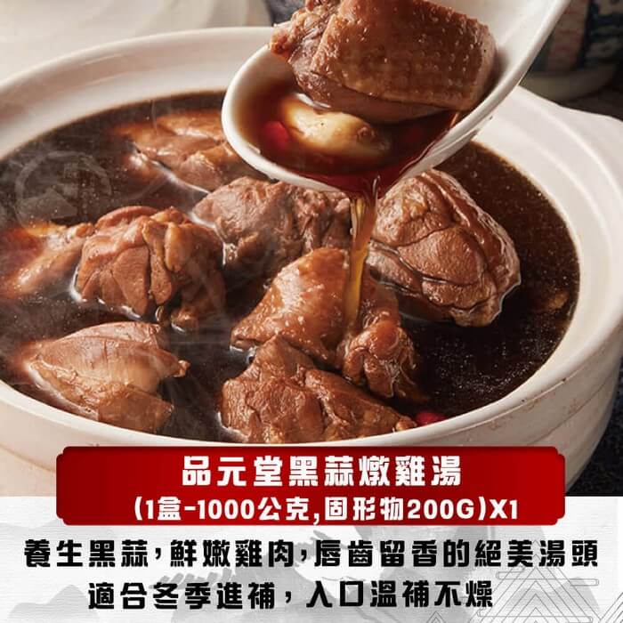 - 材質/食材:品元堂黑蒜燉雞湯-(1盒-1000公克,固形物200公克)x1包 產地: 台灣 成分: 水、雞肉、黑蒜頭、雞汁【雞油、精鹽、冰糖、香料、酵母抽出物、玉米糖膠、複方結著劑(玉米糖膠、鹿角菜膠、氯化鉀、關華豆膠、麥芽糊精)】、蒜頭、米酒、精鹽、健美鮮CL(麥芽糊精、食鹽、蔗糖、酵母抽出物、大豆水解蛋白、香菇抽出物、高麗菜抽出物)、冰糖、紅棗、醬油、枸杞、5'-次黃嘌吟核?磷酸二鈉、5'-鳥嘌呤核?磷酸二鈉 保存方式及期限:冷凍-18℃以下24個月。 過敏原標示:本產品含麩質之穀物、大豆及其製品,不適合其過敏體質者食用。 嚴選切片雞腿~1.2公分火鍋片(1包-300公克)x1包 產地: 美國? 成分: 新鮮雞肉(原肉裁切,無任何添加) 保存方式及期限:冷凍-18℃以下一年 國產黑豚-鮮嫩梅花豬肉片(1盒-200公克)x1包 產地: 台灣 成分: 新鮮豬肉(原肉裁切,無任何添加) 保存方式及期限:冷凍-18℃以下一年 鱈場蟹味棒(1盒-270公克)x1包 原產地:台灣 成份:魚漿、蛋白、大豆油、馬鈴薯澱粉、粘稠劑(醋酸澱粉)、甜味劑(D-山梨醇液70%)、香料、鹽、糖、蟹肉香料、調味劑(胺基乙酸、DL-胺基丙酸、琥珀酸二鈉、5' - 次黃嘌呤核?磷酸二鈉、5' - 鳥嘌呤核?磷酸二鈉)、品質改良劑(碳酸鈣)、胭脂紅、紅椒色素、紅麴色素、結著劑(多磷酸鈉)。 保存方式及期限:冷凍-18℃以下一年 過敏原標示:本產品含蛋、大豆、魚類及其製品、不適合其過敏體質者食用。 干貝漿-(1包-250公克)*1包 原產地:台灣 成分:金線魚(Nemipterus virgatus)、干貝柱、水、粘稠劑(醋酸澱粉)、大豆油、碗豆抽出物、馬鈴薯抽出物、粘稠劑(羧甲基纖維素鈉)、鹽、甜味劑(D-山梨醇液70%)、糖、調味劑(5'-次黃嘌呤核?磷酸二鈉、5'-鳥嘌呤核?磷酸二鈉、琥珀酸二鈉、胺基乙酸)、果糖、干貝抽出物、大豆水解蛋白、葡萄糖、魚抽出物、酵母抽出物、、昆布抽出物、雞蛋白粉、米霖(糯米、蓬萊米、果糖、水、釀造米醋、鹽)、香料、大蒜粉、辣椒、大蒜抽取物。 保存方式及期限:冷凍-18℃以下一年 過敏原標示:本產品含甲殼類、魚類、蛋及其製品,不適合其過敏體質者食用。