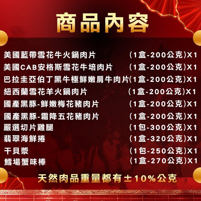 - 主商品: 【勝崎生鮮】十全涮肉鍋物福箱10件組(2340公克/10包)
