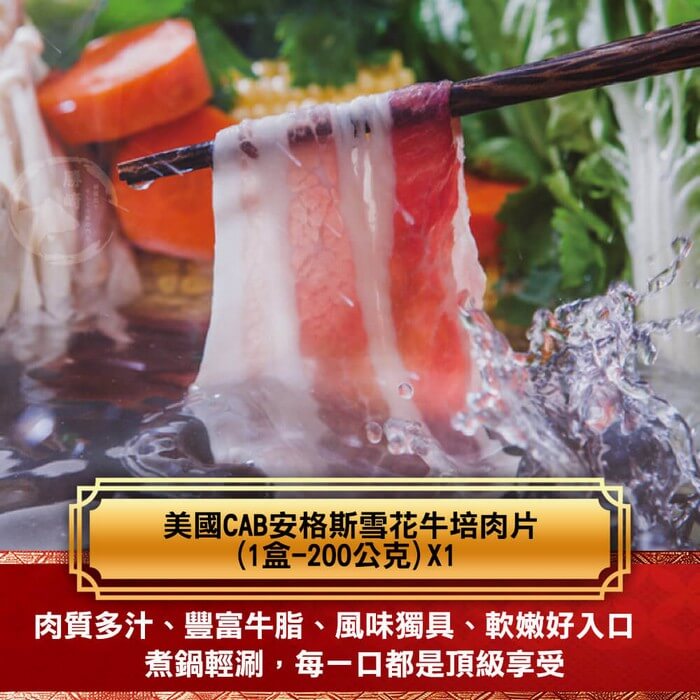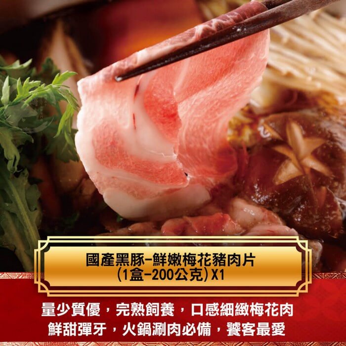 - 材質/食材:美國藍帶雪花牛火鍋肉片(1盒-200公克)x1包 產地:美國 成份:新鮮牛肉(原肉裁切,無任何添加) 冷凍-18℃以下一年 美國CAB安格斯雪花牛培肉片(1盒-200公克)x1包 產地:美國 成份:新鮮牛肉(原肉裁切,無任何添加) 冷凍-18℃以下一年 巴拉圭亞伯丁黑牛極鮮嫩肩牛肉片(1盒-200公克)x1包 產地:巴拉圭 成份:新鮮牛肉(原肉裁切,無任何添加) 冷凍-18℃以下一年 紐西蘭雪花羊火鍋肉片(1盒-200公克)x1包 產地:紐西蘭 成份:新鮮羊肉(原肉裁切,無任何添加) 冷凍-18℃以下一年 國產黑豚-鮮嫩梅花豬肉片(1盒-200公克)x1包 產地: 台灣 成分: 新鮮豬肉(原肉裁切,無任何添加) 冷凍-18℃以下一年 國產黑豚-霜降五花豬肉片(1盒-200公克)x1包 產地: 台灣 成分: 新鮮豬肉(原肉裁切,無任何添加) 冷凍-18℃以下一年 嚴選切片雞腿-1.2公分火鍋片(1包-300公克)x1包 產地: 美國 成分: 新鮮雞肉(原肉裁切,無任何添加) 冷凍-18℃以下一年 翡翠海鮮捲(1盒-320公克,8條)x1包 原產地:泰國 成份:高麗菜、魚漿(魚漿、糖、多磷酸鈉)、花枝、蝦(水、食鹽)、裹粉(醋酸澱粉、食鹽、米穀粉)、食鹽、糖、L-麩酸鈉 冷凍-18℃以下二年 過敏原標示:本產品含魚類、頭足類、甲殼類及其製品,不適合其過敏體質者食用。 干貝漿-(1包-250公克)x1包 原產地:台灣 成分:金線魚(Nemipterus virgatus)、干貝柱、水、粘稠劑(醋酸澱粉)、大豆油、碗豆抽出物、馬鈴薯抽出物、粘稠劑(羧甲基纖維素鈉)、鹽、甜味劑(D-山梨醇液70%)、糖、調味劑(5'-次黃嘌呤核?磷酸二鈉、5'-鳥嘌呤核?磷酸二鈉、琥珀酸二鈉、胺基乙酸)、果糖、干貝抽出物、大豆水解蛋白、葡萄糖、魚抽出物、酵母抽出物、、昆布抽出物、雞蛋白粉、米霖(糯米、蓬萊米、果糖、水、釀造米醋、鹽)、香料、大蒜粉、辣椒、大蒜抽取物。 冷凍-18℃以下一年 過敏原標示:本產品含甲殼類、魚類、蛋及其製品,不適合其過敏體質者食用。 鱈場蟹味棒(1盒-270公克)x1包 原產地:台灣 成份:魚漿、蛋白、大豆油、馬鈴薯澱粉、粘稠劑(醋酸澱粉)、甜味劑(D-山梨醇液70%)、香料、鹽、糖、蟹肉香料、調味劑(胺基乙酸、DL-胺基丙酸、琥珀酸二鈉、5' - 次黃嘌呤核?磷酸二鈉、5' - 鳥嘌呤核?磷酸二鈉)、品質改良劑(碳酸鈣)、胭脂紅、紅椒色素、紅麴色素、結著劑(多磷酸鈉)。 冷凍-18℃以下一年 過敏原標示:本產品含蛋、大豆、魚類及其製品、不適合其過敏體質者食用。