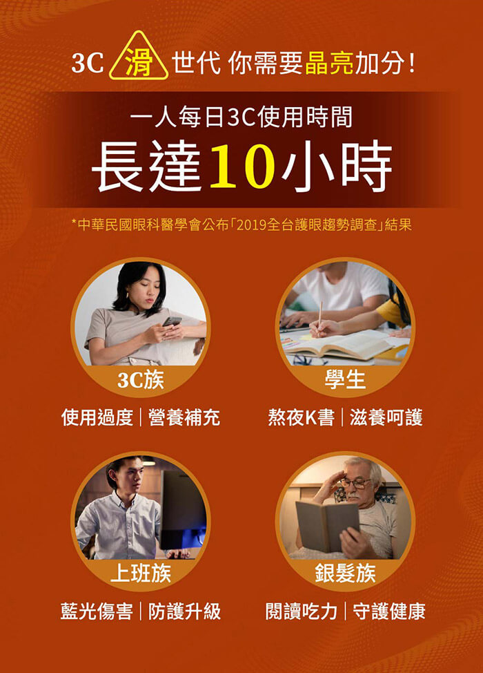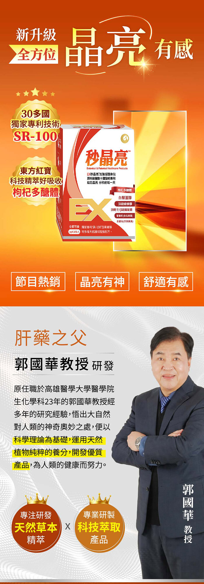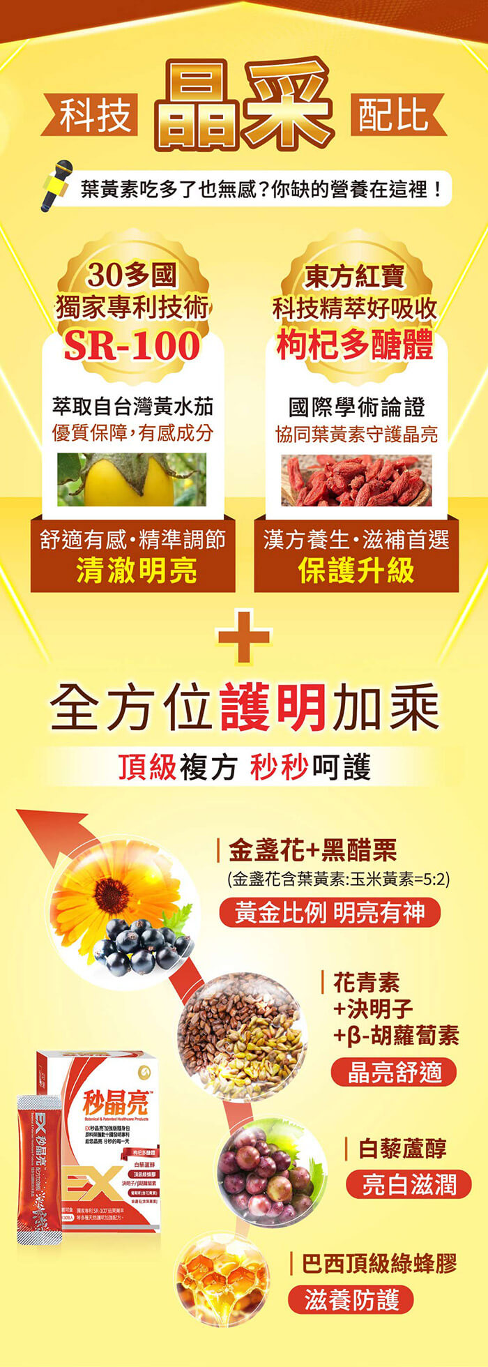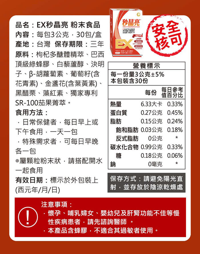 - 內容物名稱:枸杞多醣體菁萃、巴西頂級綠蜂膠、白藜蘆醇、決明子、β胡蘿蔔素、葡萄籽(含花青素)、金盞花(含葉黃素)、黑酷栗、藻紅素、世界獨家專利SR-100茄果菁萃等多種天然護明加強配方