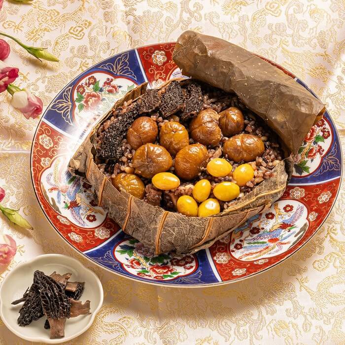 羊肚菌鮮栗荷葉飯,羊肚菌是珍稀食用菌,被譽為「菌中之王」,不僅風味獨特、口感細緻,更富含多種營養成分與健康功效。以羊肚菌為主角,搭配香菇、栗子、松子、銀杏與芋頭等豐富食材,層層堆疊出多層次的香氣與口感。另將傳統油飯升級為獨家比例調配的糙米與紫米,更符合現代人健康飲食的需求。 外層並以清香荷葉包裹蒸煮,使米飯吸附淡雅荷香,香氣馥郁、口感溫潤,展現健康、美味與年節團圓的美好交融。