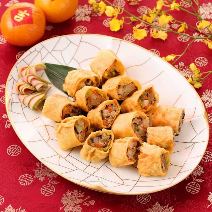 呼應承襲古早味雞捲珍惜食物的情懷,GREEN&SAFE特別研發蔬食也能享用的版本,師傅特別選用口感清脆的蔬菜為基底,將豆薯、金針菇、黑木耳、胡蘿蔔、筍絲截切成相互呼應的大小,搭配豆干和豆腸增加飽足感和蛋白質來源,再以芹菜、香菜和香油點綴風味悉心混合,最後用豆腐皮把混合好的餡料和師傅精準的調味包入一捲捲金色討喜的捲子中。