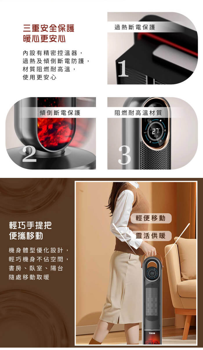 可左右旋轉,廣角送暖,防傾倒裝置。
