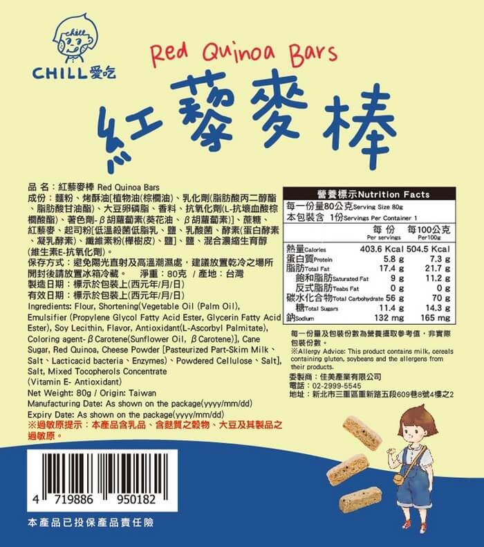 - 主商品:【CHILL愛吃】紅藜麥穀物棒/奶素 (80g/包)x8包