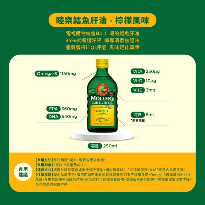 - 主商品:鱈魚肝油(檸檬風味)(250ml)/瓶x3