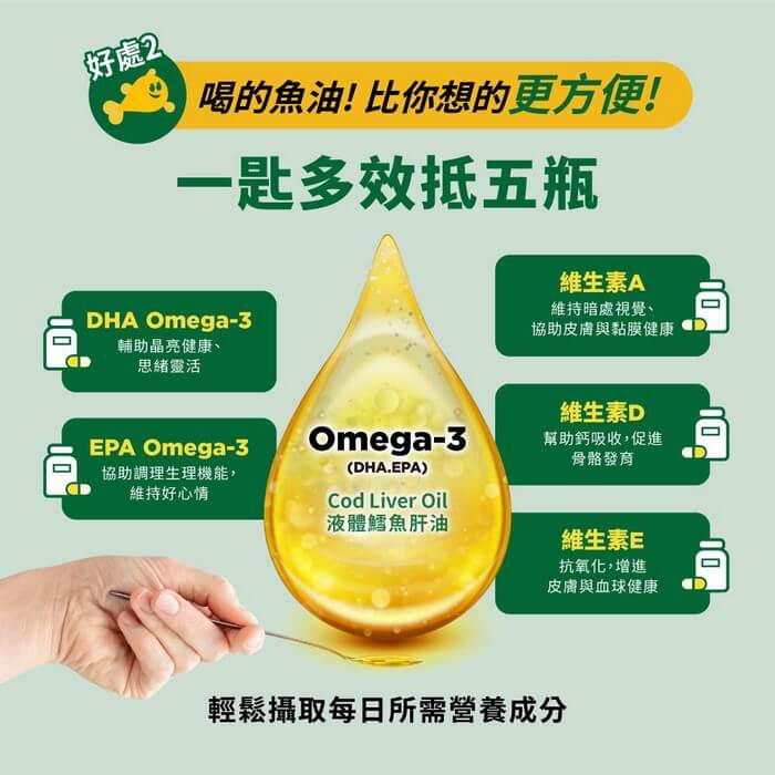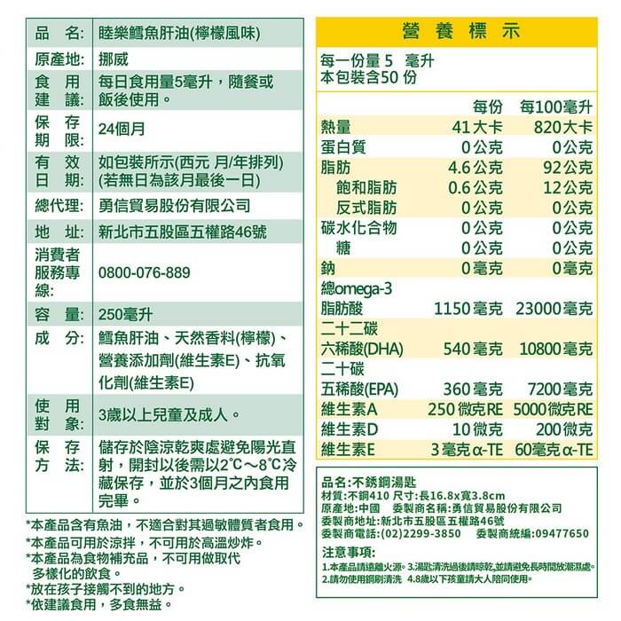 - 內容物名稱:鱈魚肝油、天然香料、營養添加劑(維生素E)、抗氧化劑(維生素E)