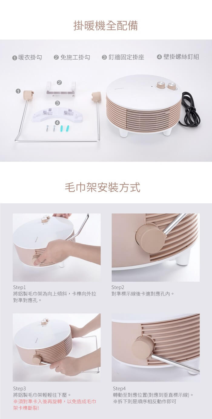 - 配件:毛巾架x1、鎖牆掛勾x1、一般掛勾x1、膨脹螺塞x2、膨脹螺絲x2、說明書x1、安裝說明x1、保證卡x1