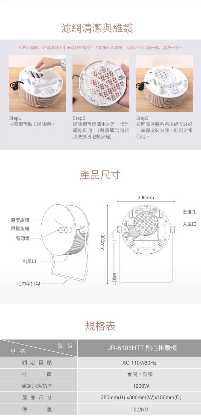 - 主商品:電暖器x1(JR-5103HTT)(含:後網蓋x1)