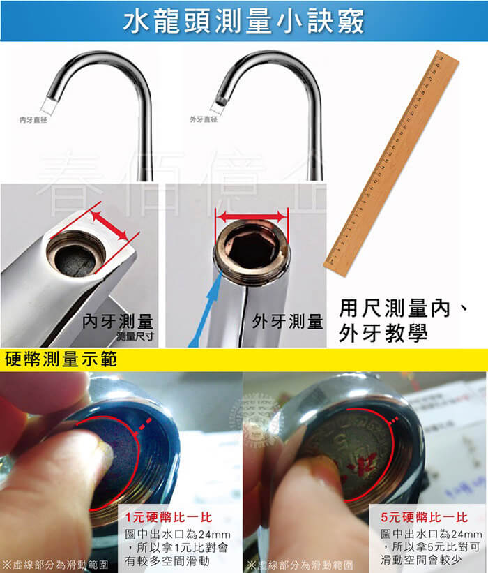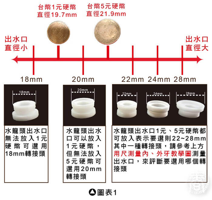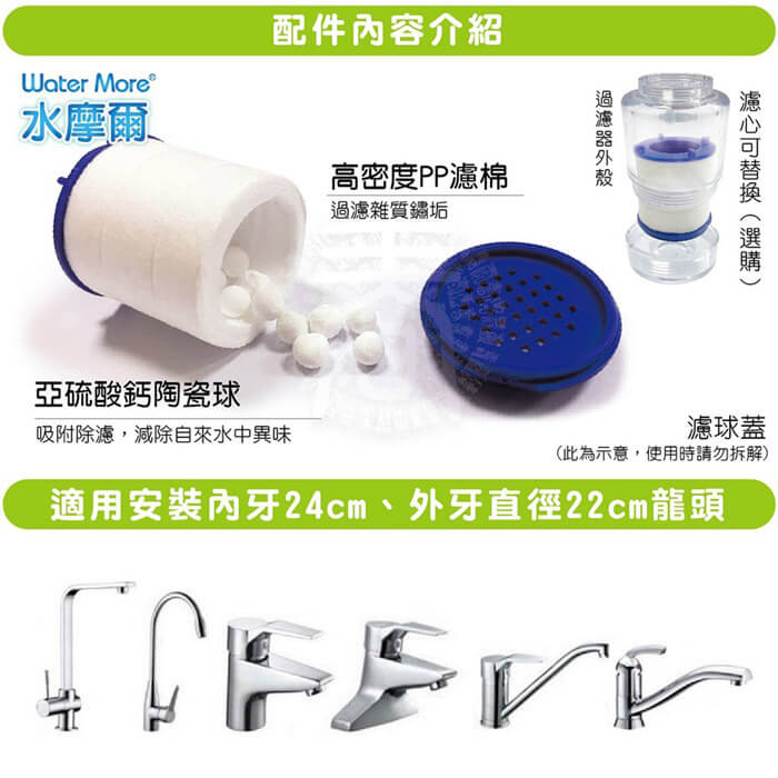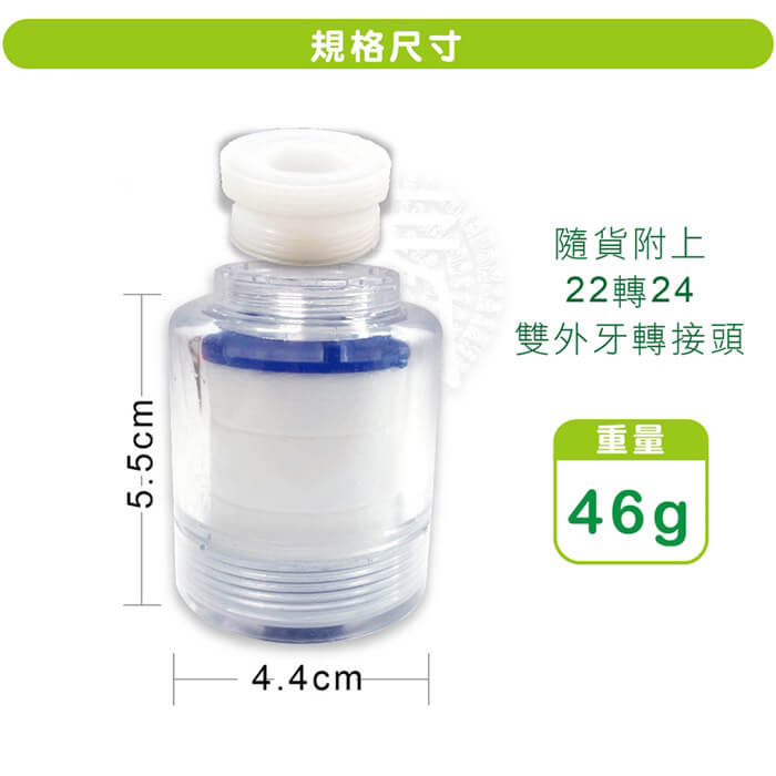 - 贈品尺寸/規格/重量:加長管:直徑2.2cmx11cm/重量:23g 萬用轉換配件包:總重量:18g 止洩帶-直徑46x18mm 外牙22轉18-直徑22x13mm 外牙22轉20-直徑22x13mm 外牙22轉22-直徑22x13mm 外牙22轉28-直徑28x13mm 無牙規轉接頭:37x34mm(適用約直徑15mm-23.5mm外徑之出水頭)/重量:20.6g